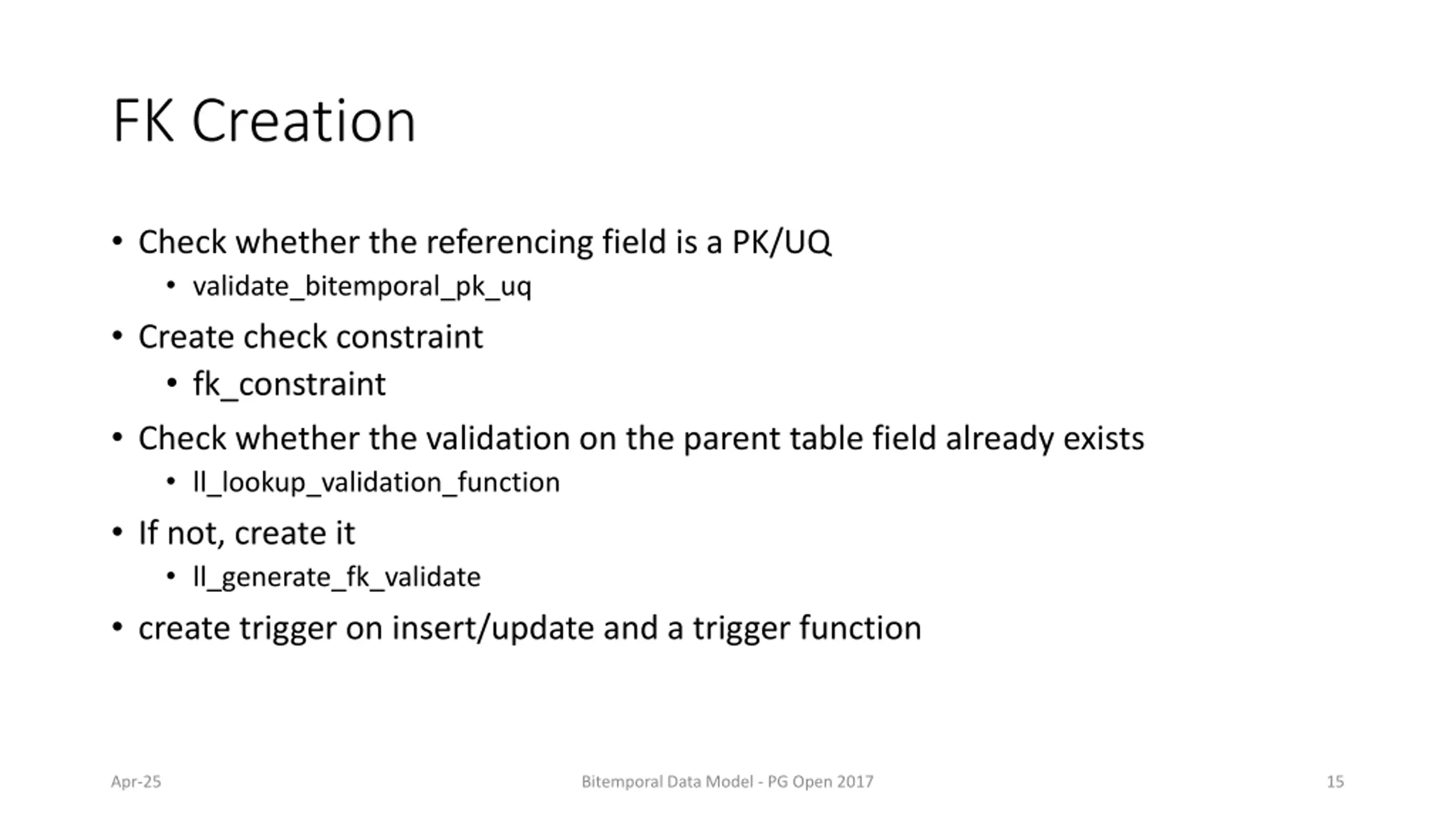 Defining Foreign Key Constraint The difficulty of verifying the bi-temporal FK is that the PK/UQ in the parent table should be effective and asserted all the time when a dependent record is effective/asserted CONSTRAINT "bitemporal fk postgres_version_database_versionsrelease_version" check (true or 'fk' <> '@postgres_version -> database_versions(release_version)@')); Function: select bitemporal_internal.fk_constraint( 'postgres_version ,'database_versions ,'release_version'); Apr-25 Bitemporal Data Model - PG Open 2017 14