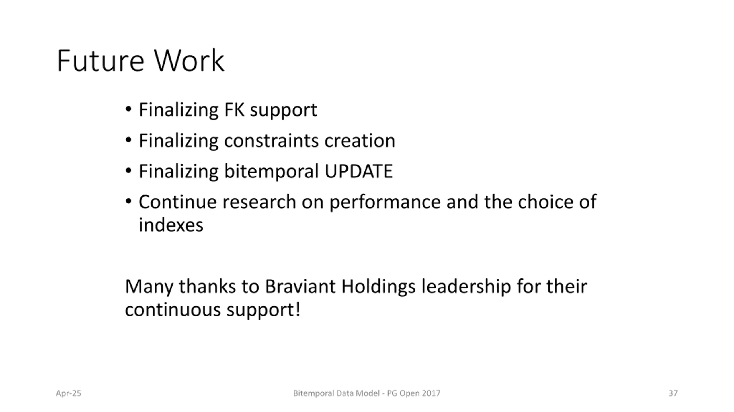 Future Work Finalizing FK support Finalizing constraints creation Finalizing bitemporal UPDATE Continue research on performance and the choice of indexes Many thanks to Braviant Holdings leadership for their continuous support! Apr-25 Bitemporal Data Model - PG Open 2017 37