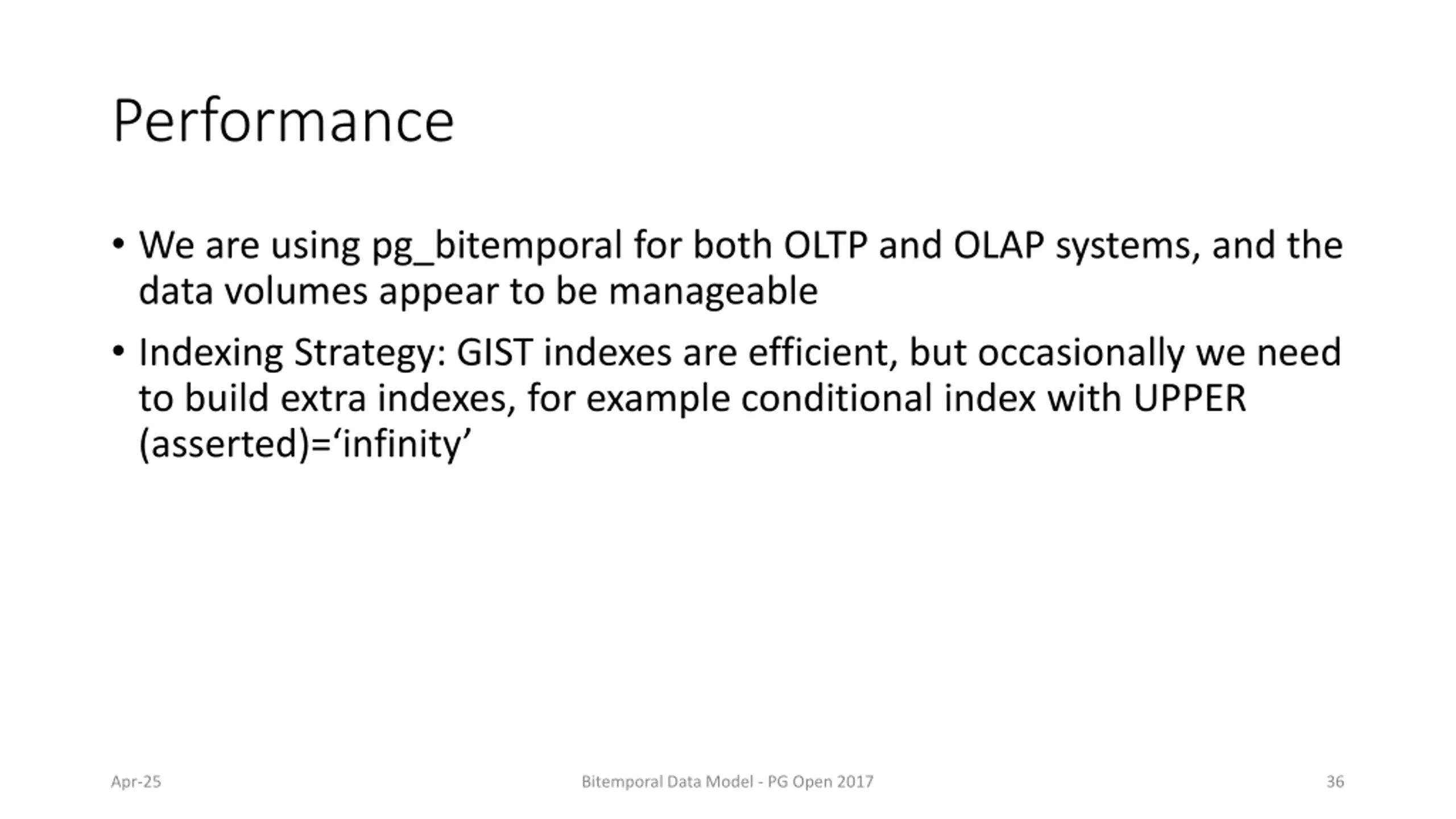 Performance We are using pg_bitemporal for both OLTP and OLAP systems, and the data volumes appear to be manageable Indexing Strategy: GIST indexes are efficient, but occasionally we need to build extra indexes, for example conditional index with UPPER (asserted)= infinity Apr-25 Bitemporal Data Model - PG Open 2017 36