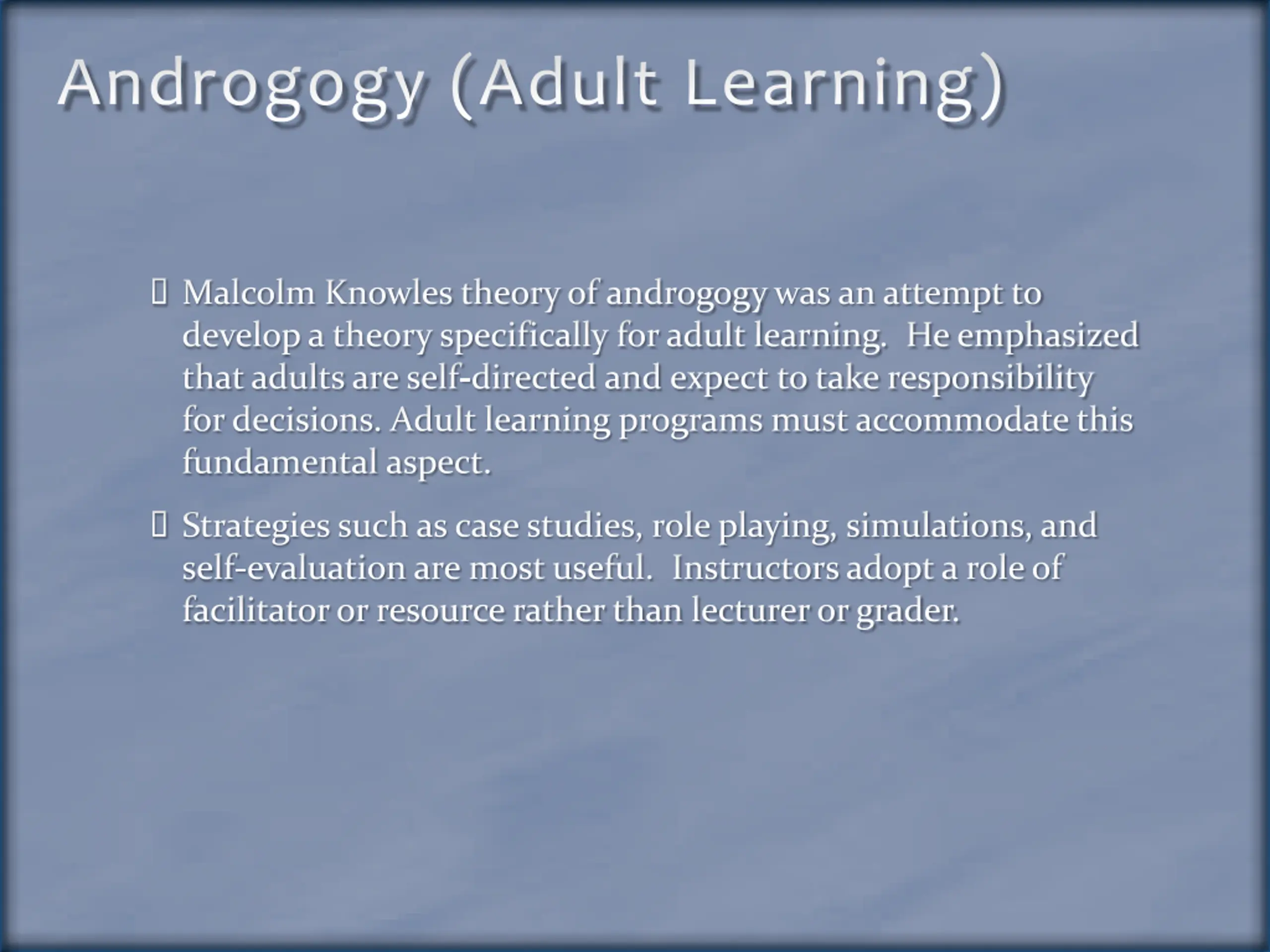 Androgogy (Adult Learning) Malcolm Knowles theory of androgogywas an attempt to develop a theory specifically for adult learning. He emphasized that adults are self-directed and expect to take responsibility for decisions. Adult learning programs must accommodate this fundamental aspect. Strategies such as case studies, role playing, simulations, and self-evaluation are most useful. Instructors adopt a role of facilitator or resource rather than lecturer or grader.