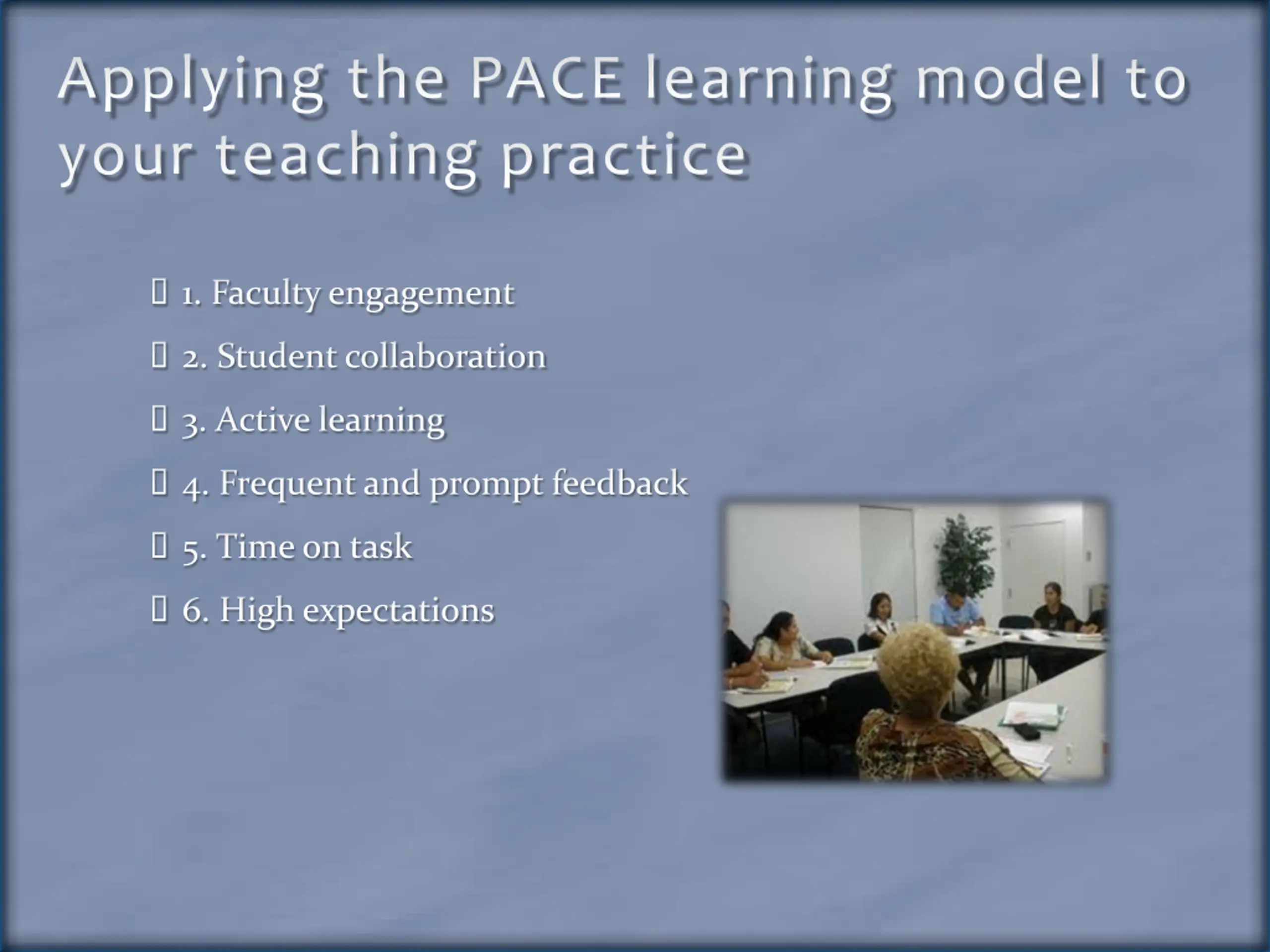 Applying the PACE learning model to your teaching practice 1. Faculty engagement 2. Student collaboration 3. Active learning 4. Frequent and prompt feedback 5. Time on task 6. High expectations