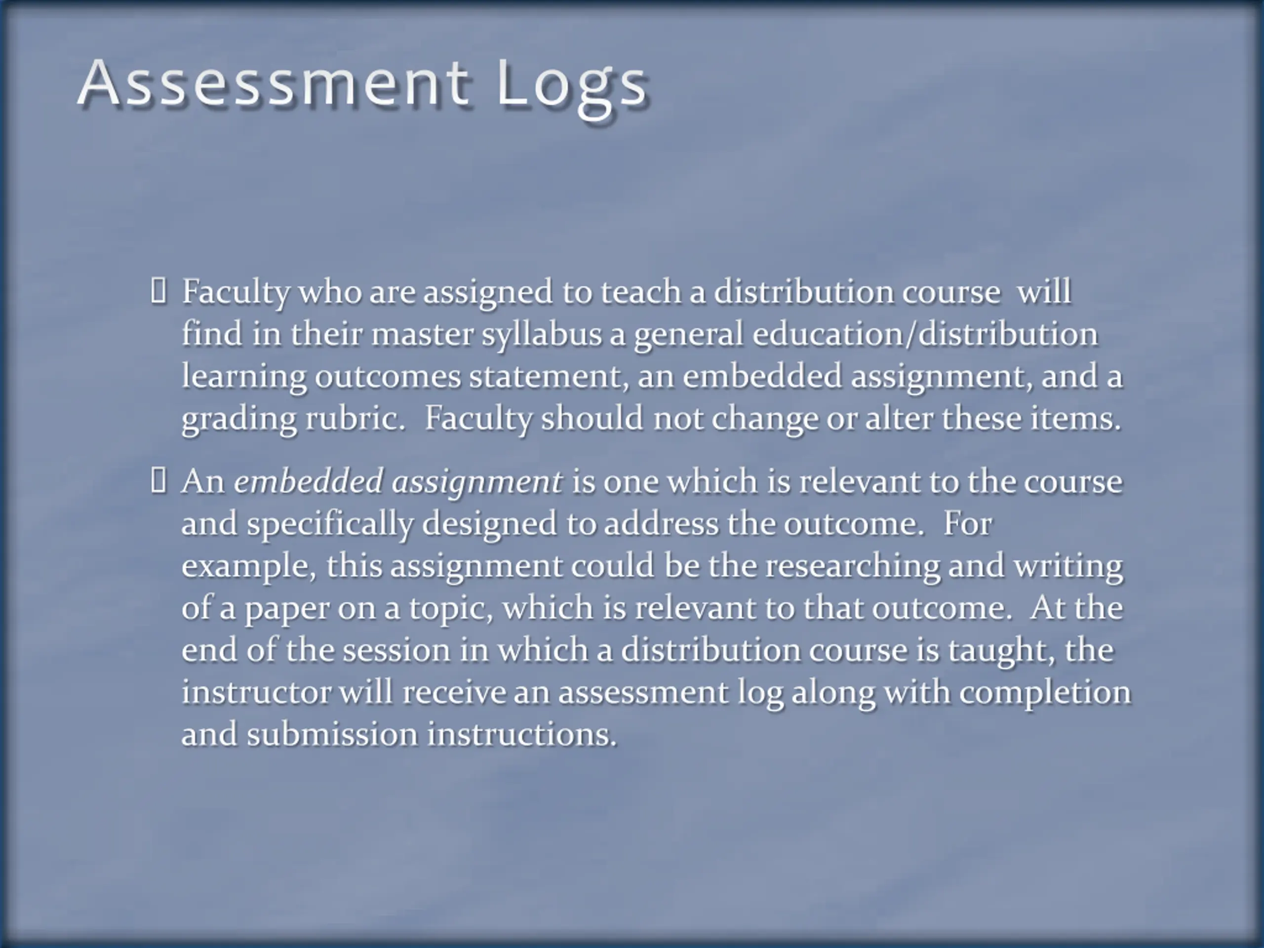 Assessment Logs Faculty who are assigned to teach a distribution course will find in their master syllabus a general education/distribution learning outcomes statement, an embedded assignment, and a grading rubric. Faculty should not change or alter these items. An embedded assignment is one which is relevant to the course and specifically designed to address the outcome. For example, this assignment could be the researching and writing of a paper on a topic, which is relevant to that outcome. At the end of the session in which a distribution course is taught, the instructor will receive an assessment log along with completion and submission instructions.