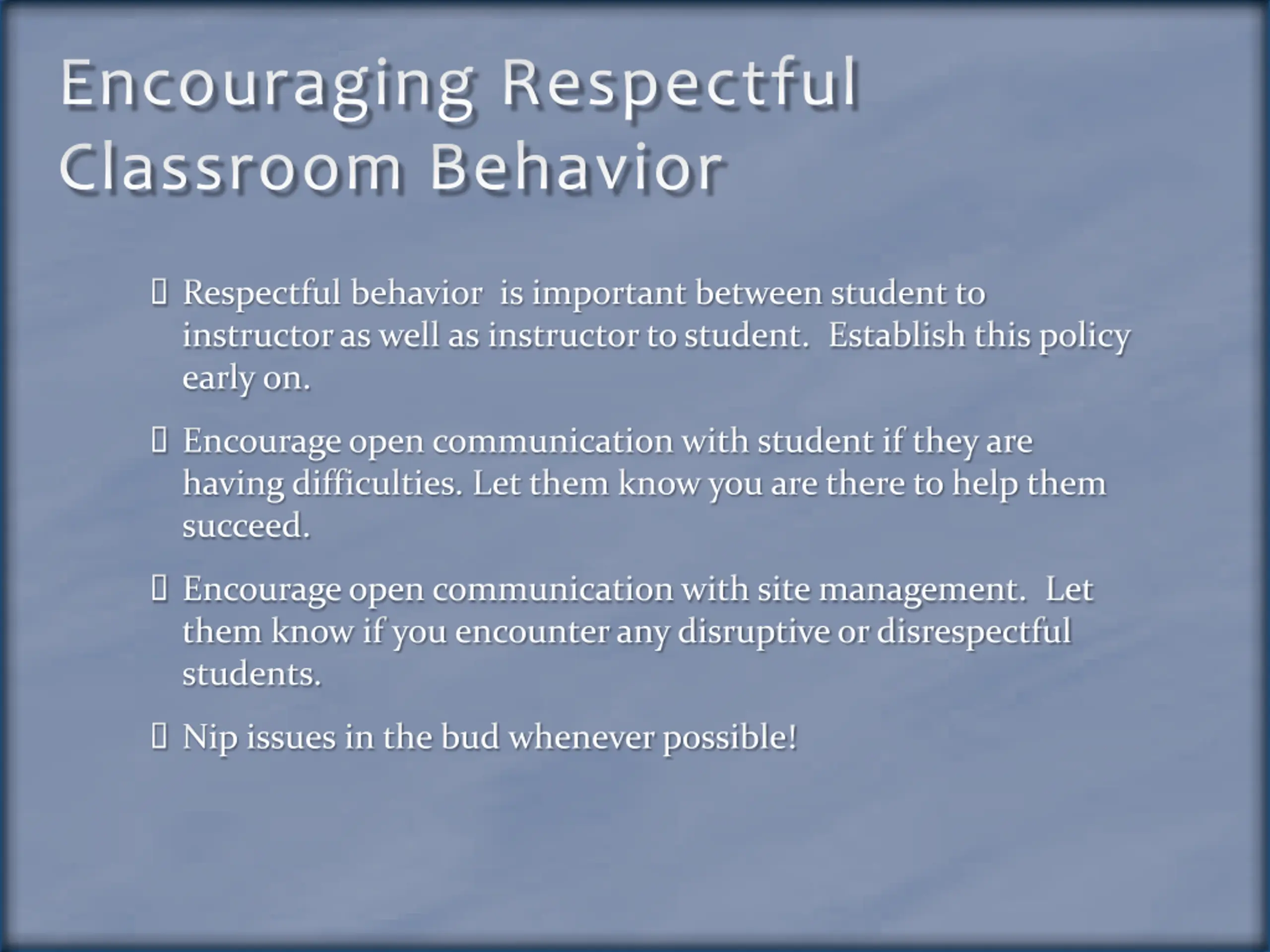 Encouraging Respectful Classroom Behavior Respectful behavior is important between student to instructor as well as instructor to student. Establish this policy early on. Encourage open communication with student if they are having difficulties. Let them know you are there to help them succeed. Encourage open communication with site management. Let them know if you encounter any disruptive or disrespectful students. Nip issues in the bud whenever possible!