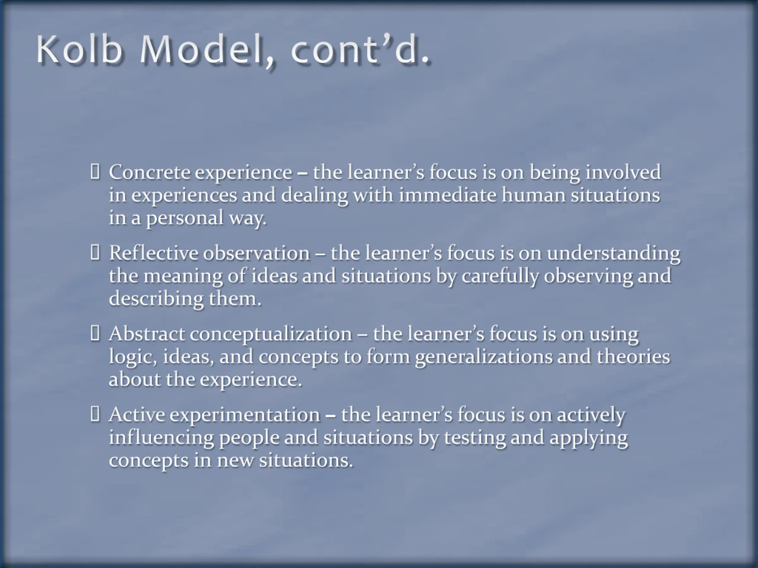 Kolb Model, contd. Concrete experience the learner s focus is on being involved in experiences and dealing with immediate human situations in a personal way. Reflective observation the learner s focus is on understanding the meaning of ideas and situations by carefully observing and describing them. Abstract conceptualization the learner s focus is on using logic, ideas, and concepts to form generalizations and theories about the experience. Active experimentation the learner s focus is on actively influencing people and situations by testing and applying concepts in new situations.