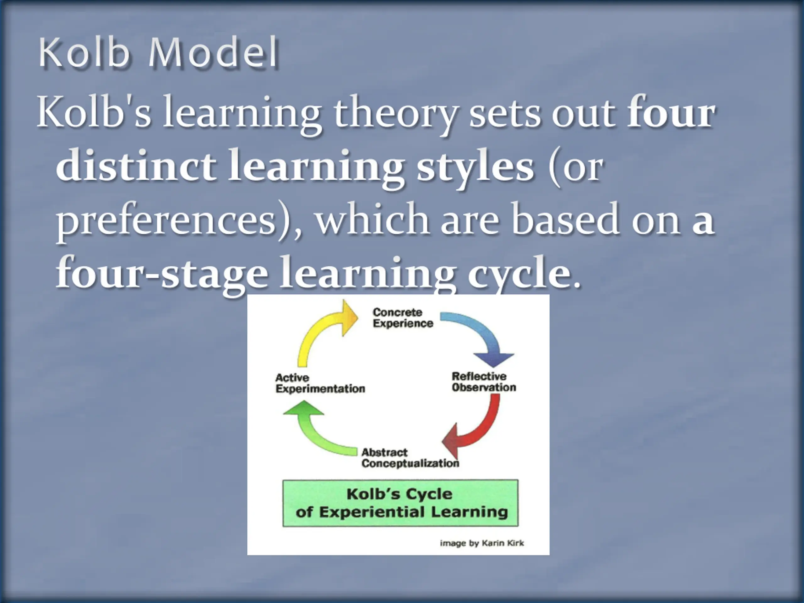 Kolb Model Kolb's learning theory sets out four distinct learning styles (or preferences), which are based on a four-stage learning cycle.