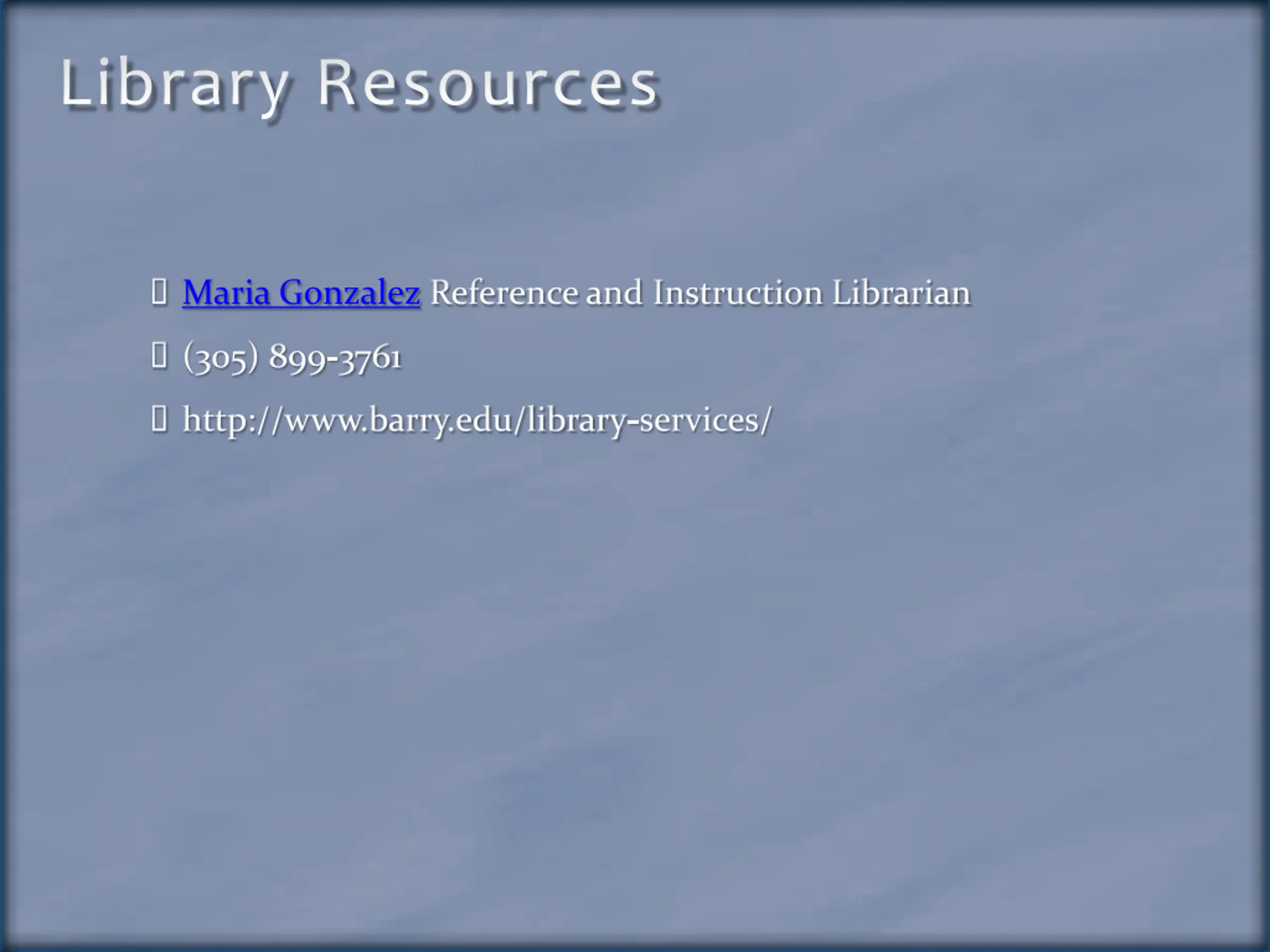 Library Resources Maria Gonzalez Reference and Instruction Librarian (305) 899-3761 http://www.barry.edu/library-services/