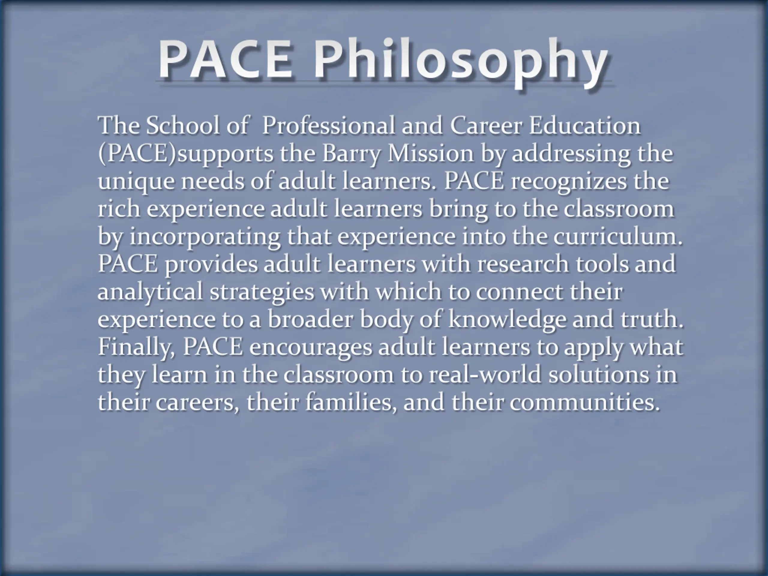 PACE Philosophy The School of Professional and Career Education (PACE)supports the Barry Mission by addressing the unique needs of adult learners. PACE recognizes the rich experience adult learners bring to the classroom by incorporating that experience into the curriculum. PACE provides adult learners with research tools and analytical strategies with which to connect their experience to a broader body of knowledge and truth. Finally, PACE encourages adult learners to apply what they learn in the classroom to real-world solutions in their careers, their families, and their communities.