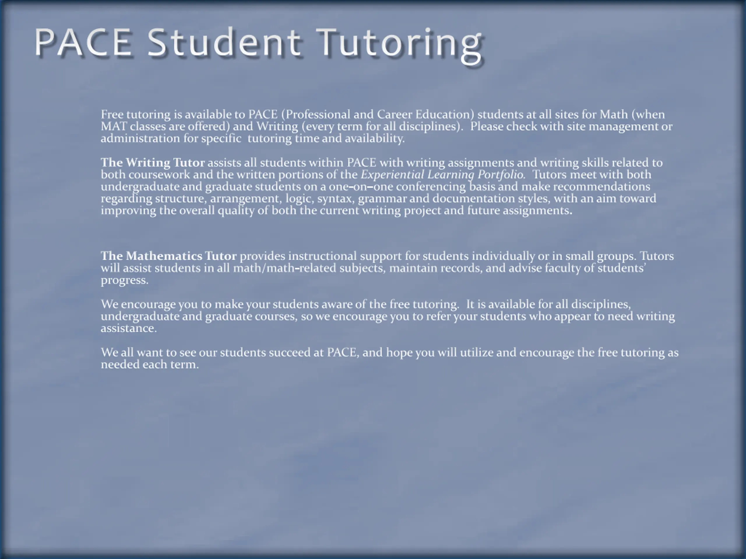 PACE Student Tutoring Free tutoring is available to PACE (Professional and Career Education) students at all sites for Math (when MAT classes are offered) and Writing (every term for all disciplines). Please check with site management or administration for specific tutoring time and availability. The Writing Tutor assists all students within PACE with writing assignments and writing skills related to both coursework and the written portions of the Experiential Learning Portfolio. Tutors meet with both undergraduate and graduate students on a one-on one conferencing basis and make recommendations regarding structure, arrangement, logic, syntax, grammar and documentation styles, with an aim toward improving the overall quality of both the current writing project and future assignments. The Mathematics Tutor provides instructional support for students individually or in small groups. Tutors will assist students in all math/math-related subjects, maintain records, and advise faculty of students progress. We encourage you to make your students aware of the free tutoring. It is available for all disciplines, undergraduate and graduate courses, so we encourage you to refer your students who appear to need writing assistance. We all want to see our students succeed at PACE, and hope you will utilize and encourage the free tutoring as needed each term.