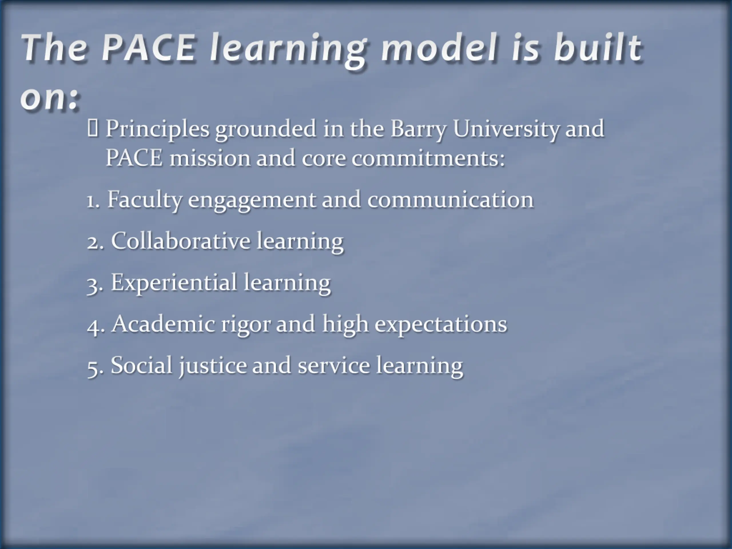 The PACE learning model is built on: Principles grounded in the Barry University and PACE mission and core commitments: 1. Faculty engagement and communication 2. Collaborative learning 3. Experiential learning 4. Academic rigor and high expectations 5. Social justice and service learning