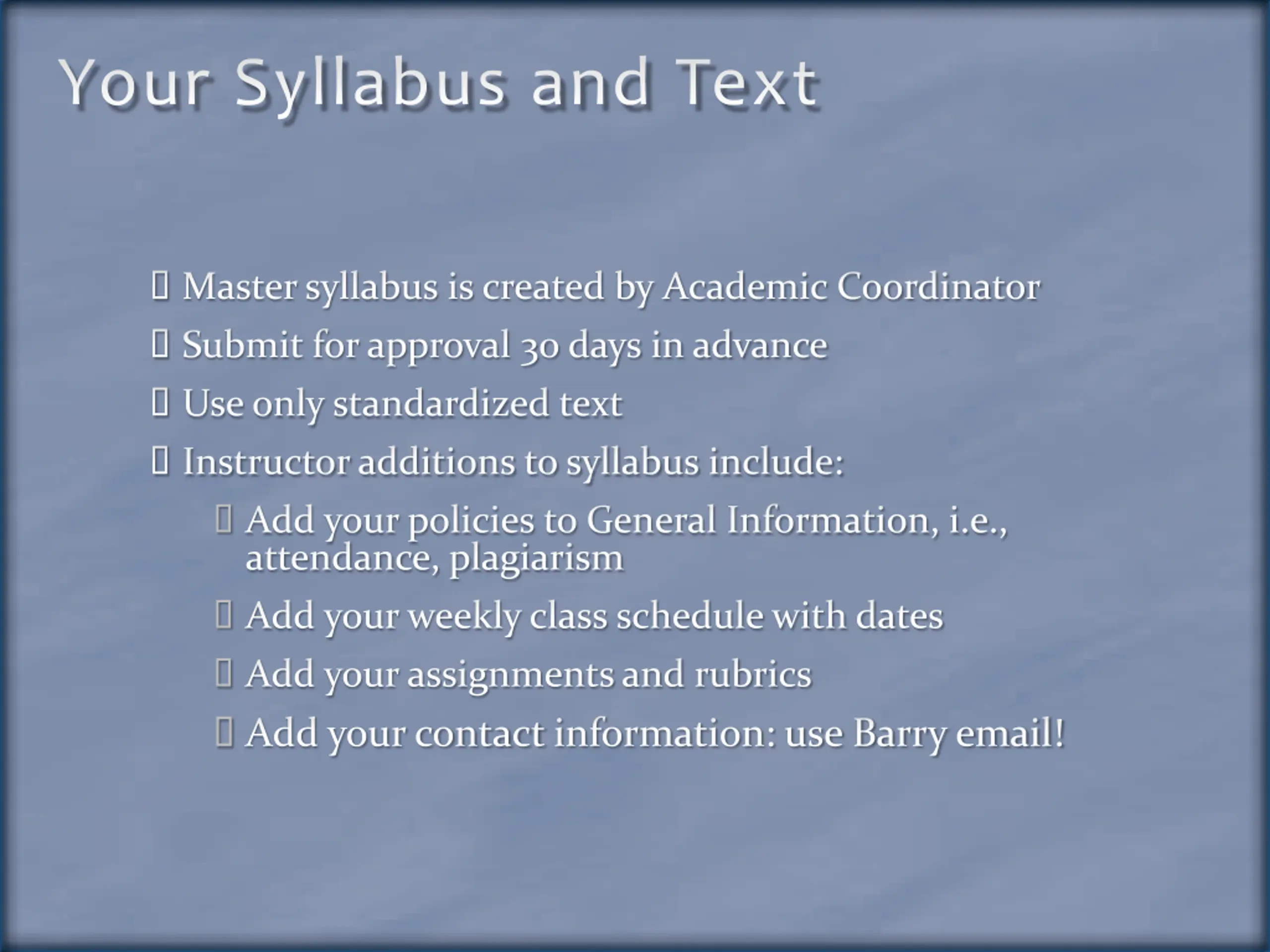 Your Syllabus and Text Master syllabus is created by Academic Coordinator Submit for approval 30 days in advance Use only standardized text Instructor additions to syllabus include: Add your policies to General Information, i.e., attendance, plagiarism Add your weekly class schedule with dates Add your assignments and rubrics Add your contact information: use Barry email!