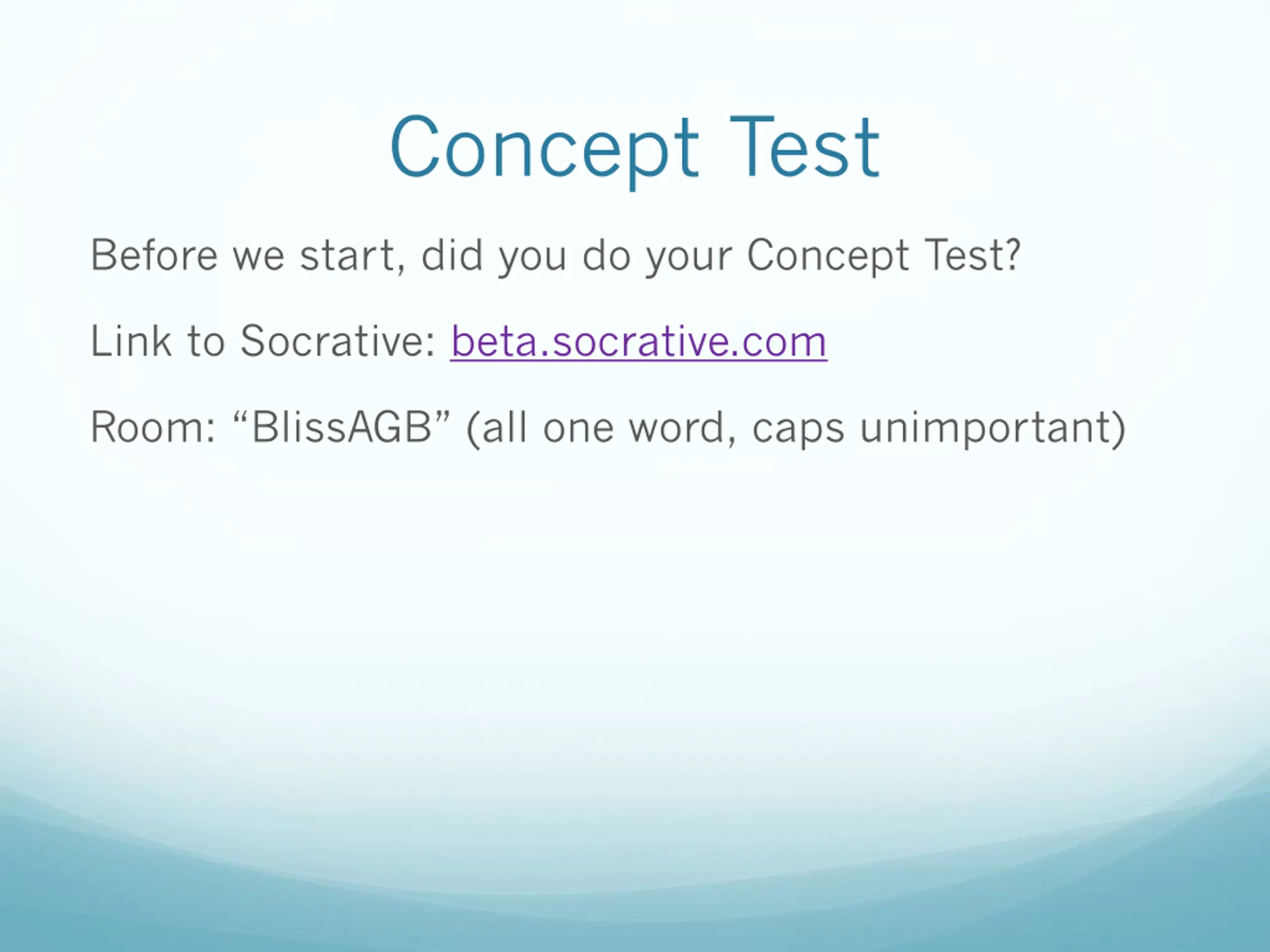 Concept Test Before we start, did you do your Concept Test? Link to Socrative: beta.socrative.com Room: BlissAGB (all one word, caps unimportant)