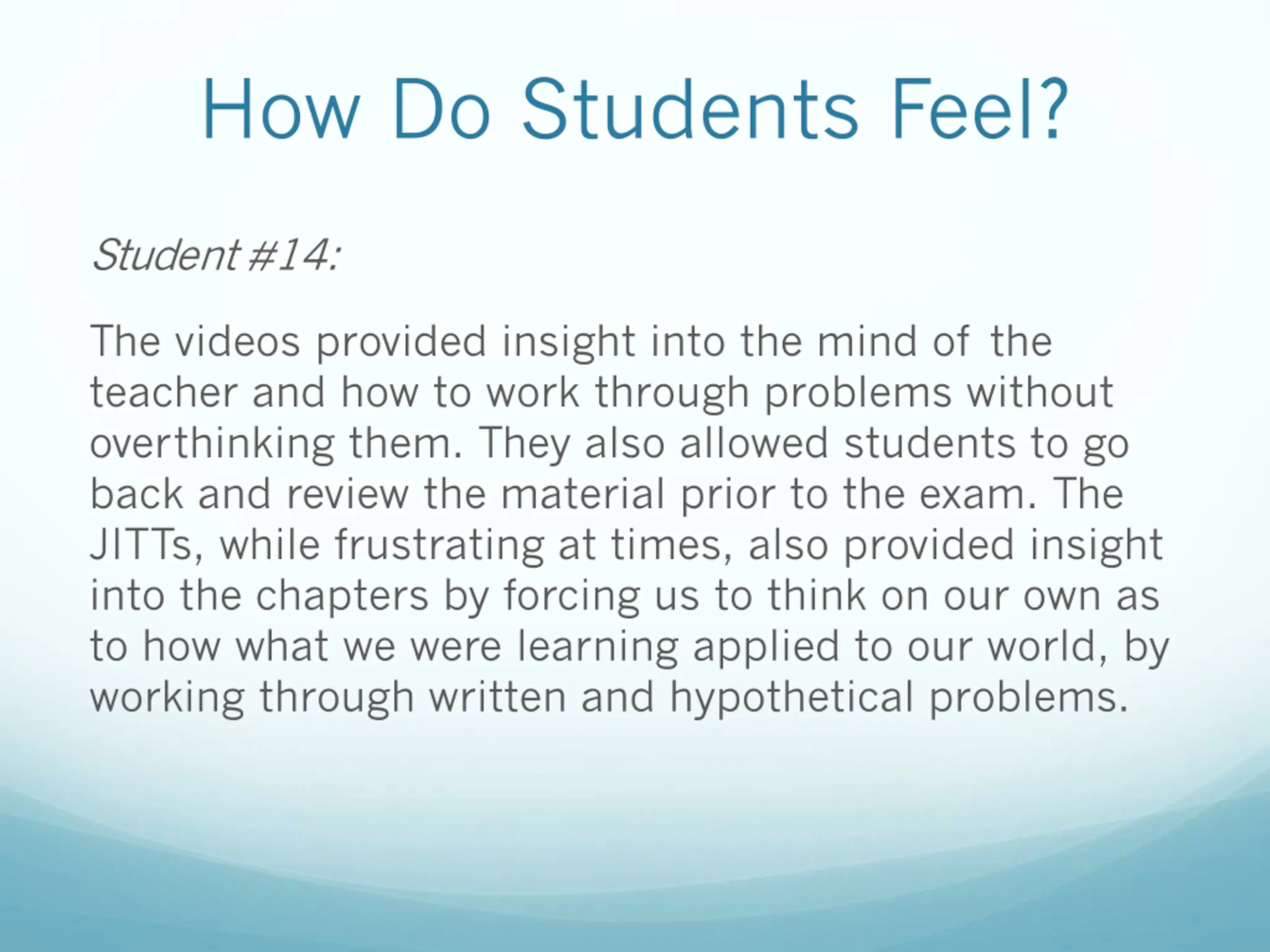How Do Students Feel? Student #14: The videos provided insight into the mind of the teacher and how to work through problems without overthinking them. They also allowed students to go back and review the material prior to the exam. The JITTs, while frustrating at times, also provided insight into the chapters by forcing us to think on our own as to how what we were learning applied to our world, by working through written and hypothetical problems.
