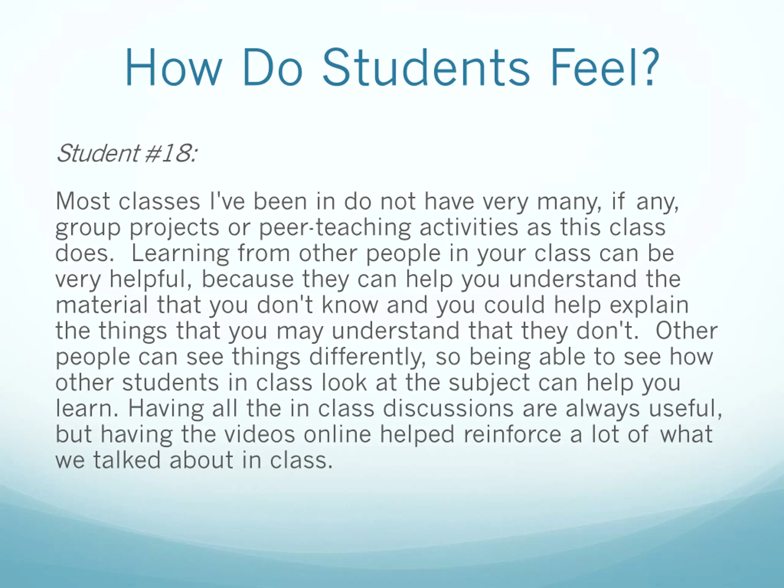 How Do Students Feel? Student #18: Most classes I've been in do not have very many, if any, group projects or peer-teaching activities as this class does. Learning from other people in your class can be very helpful, because they can help you understand the material that you don't know and you could help explain the things that you may understand that they don't. Other people can see things differently, so being able to see how other students in class look at the subject can help you learn. Having all the in class discussions are always useful, but having the videos online helped reinforce a lot of what we talked about in class.