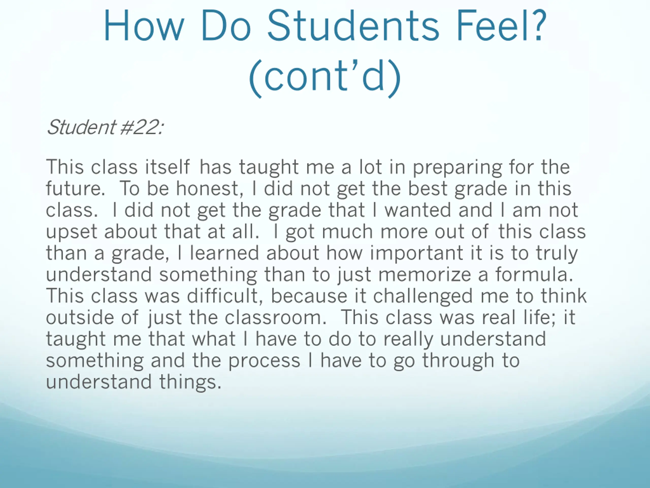 How Do Students Feel? (cont d) Student #22: This class itself has taught me a lot in preparing for the future. To be honest, I did not get the best grade in this class. I did not get the grade that I wanted and I am not upset about that at all. I got much more out of this class than a grade, I learned about how important it is to truly understand something than to just memorize a formula. This class was difficult, because it challenged me to think outside of just the classroom. This class was real life; it taught me that what I have to do to really understand something and the process I have to go through to understand things.