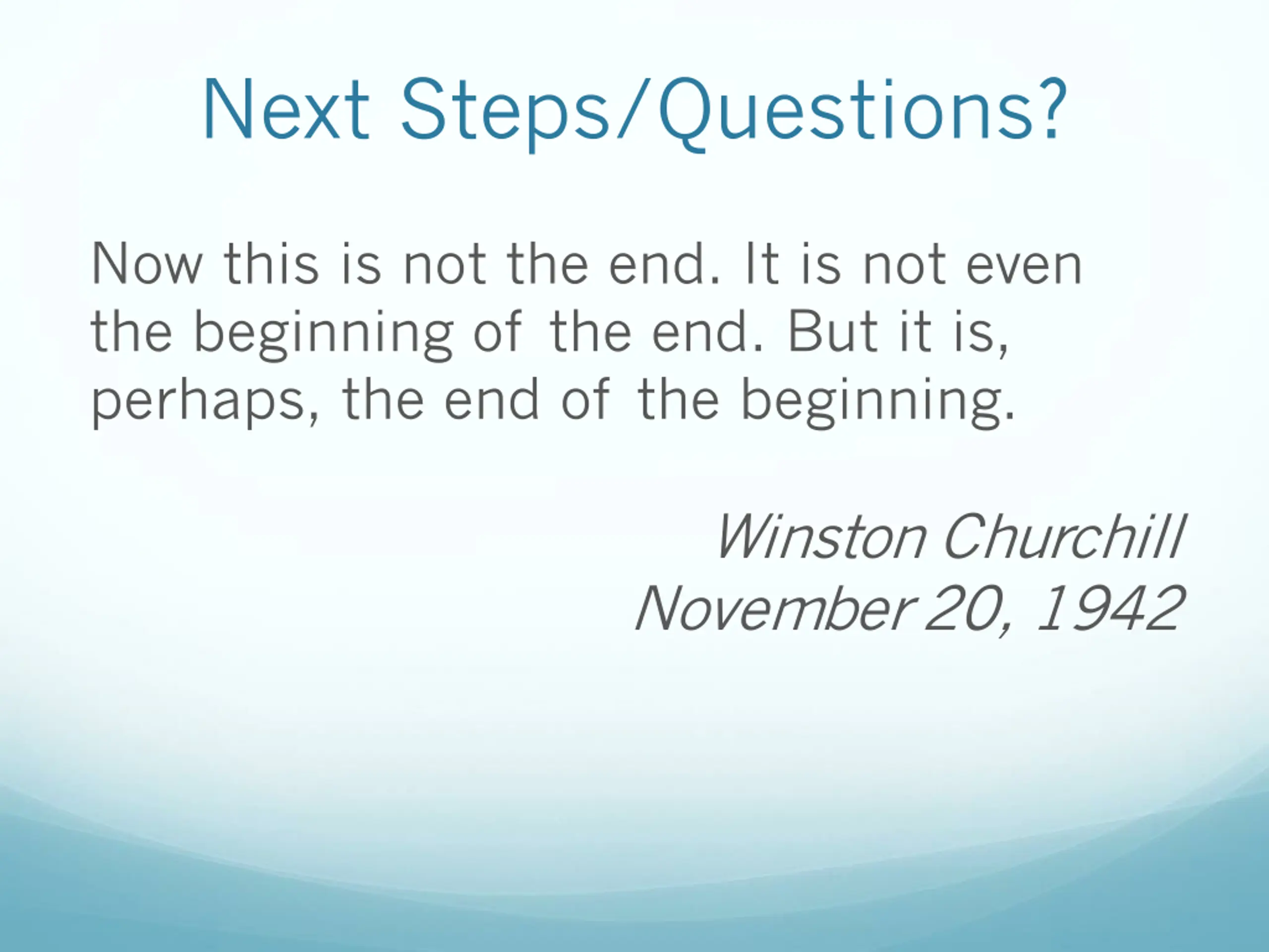 Next Steps/Questions? Now this is not the end. It is not even the beginning of the end. But it is, perhaps, the end of the beginning. Winston Churchill November 20, 1942