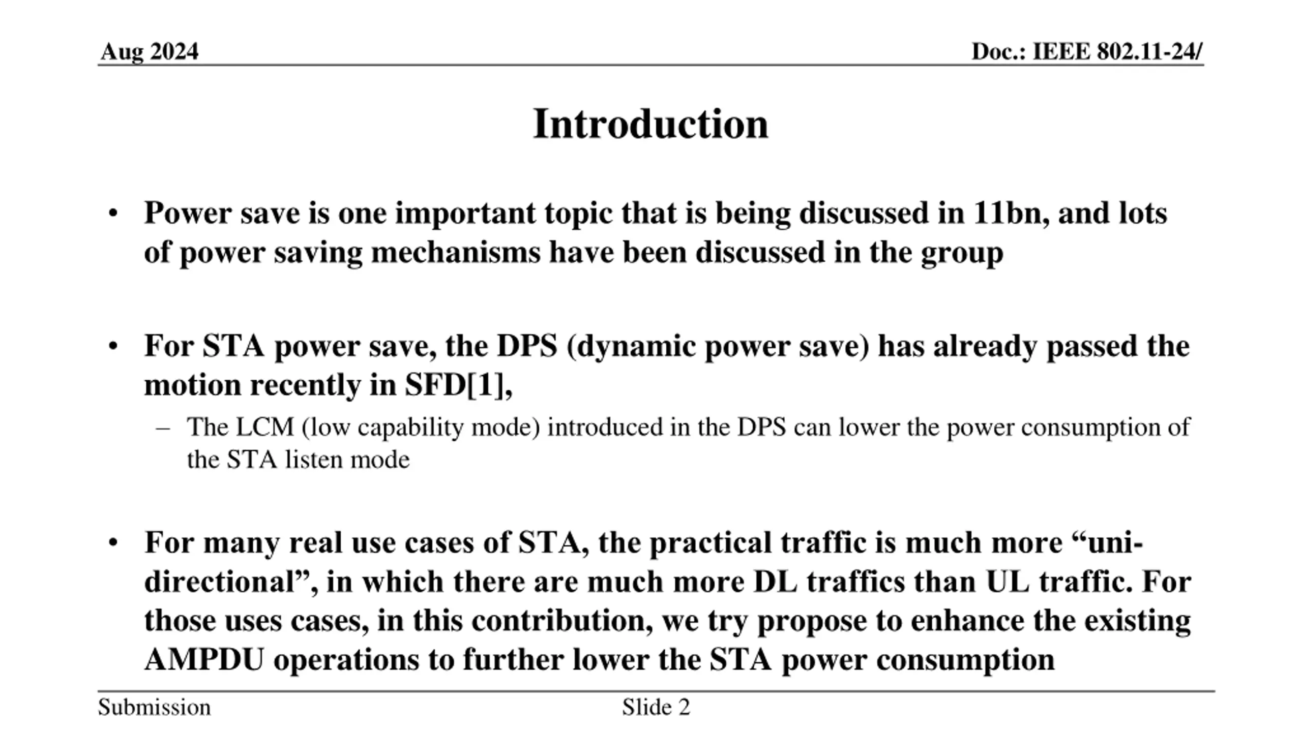 Aug 2024 Doc.: IEEE 802.11-24/ Introduction Power save is one important topic that is being discussed in 11bn, and lots of power saving mechanisms have been discussed in the group For STA power save, the DPS (dynamic power save) has already passed the motion recently in SFD[1], The LCM (low capability mode) introduced in the DPS can lower the power consumption of the STA listen mode For many real use cases of STA, the practical traffic is much more uni- directional , in which there are much more DL traffics than UL traffic. For those uses cases, in this contribution, we try propose to enhance the existing AMPDU operations to further lower the STA power consumption Submission Slide 2