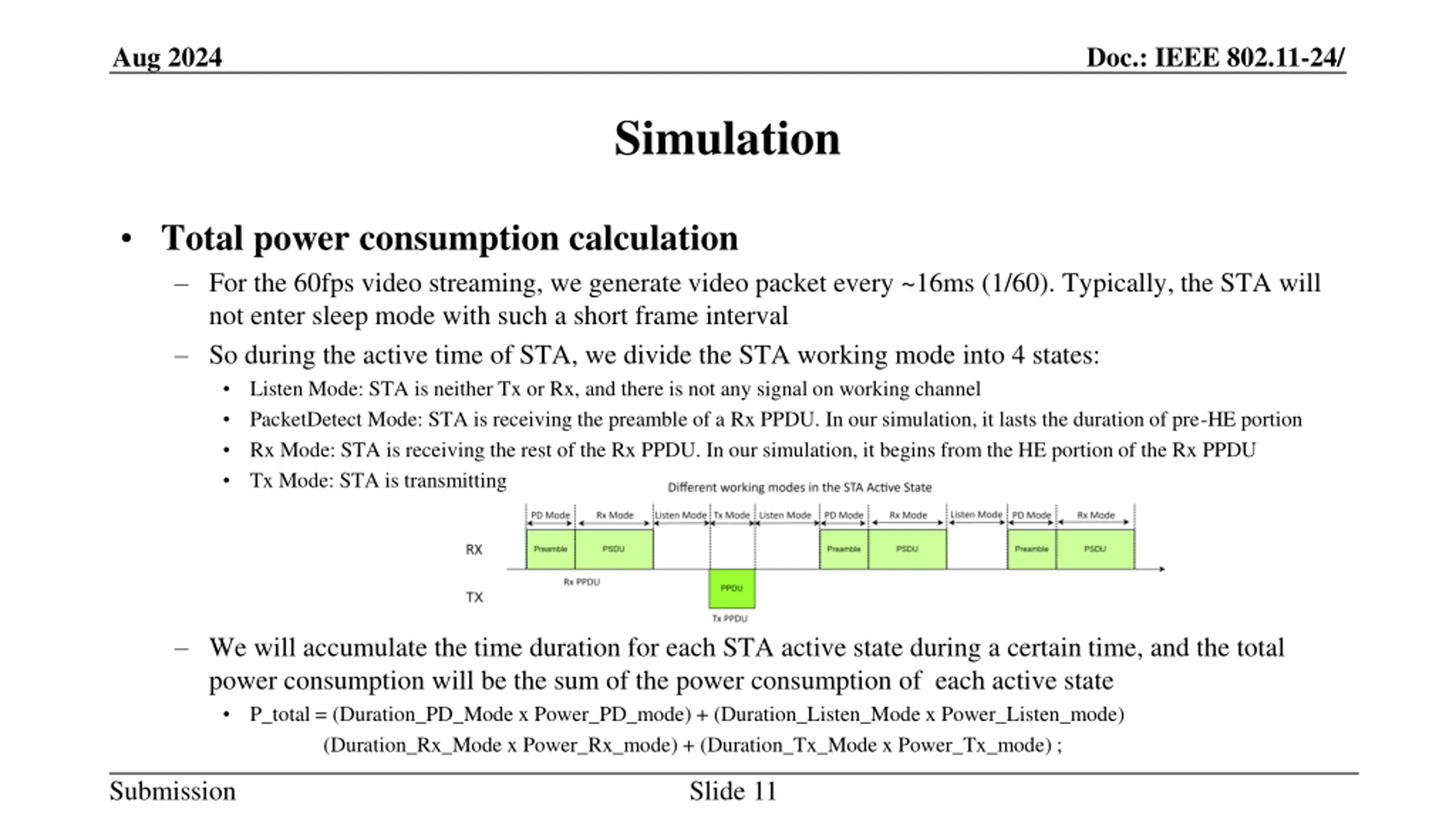 Aug 2024 Doc.: IEEE 802.11-24/ Simulation Total power consumption calculation For the 60fps video streaming, we generate video packet every ~16ms (1/60). Typically, the STA will not enter sleep mode with such a short frame interval So during the active time of STA, we divide the STA working mode into 4 states: Listen Mode: STA is neither Tx or Rx, and there is not any signal on working channel PacketDetect Mode: STA is receiving the preamble of a Rx PPDU. In our simulation, it lasts the duration of pre-HE portion Rx Mode: STA is receiving the rest of the Rx PPDU. In our simulation, it begins from the HE portion of the Rx PPDU Tx Mode: STA is transmitting We will accumulate the time duration for each STA active state during a certain time, and the total power consumption will be the sum of the power consumption of each active state P_total = (Duration_PD_Mode x Power_PD_mode) + (Duration_Listen_Mode x Power_Listen_mode) (Duration_Rx_Mode x Power_Rx_mode) + (Duration_Tx_Mode x Power_Tx_mode) ; Submission Slide 11