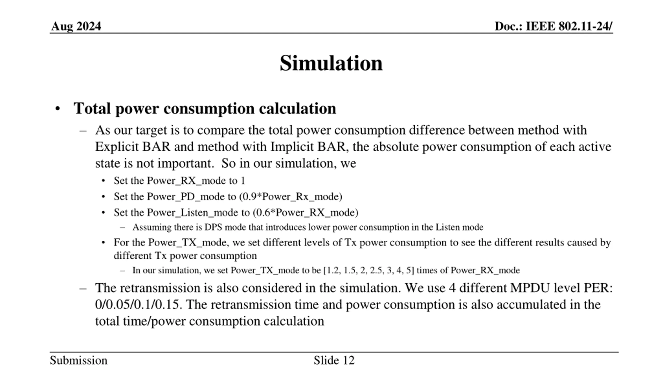 Aug 2024 Doc.: IEEE 802.11-24/ Simulation Total power consumption calculation As our target is to compare the total power consumption difference between method with Explicit BAR and method with Implicit BAR, the absolute power consumption of each active state is not important. So in our simulation, we Set the Power_RX_mode to 1 Set the Power_PD_mode to (0.9*Power_Rx_mode) Set the Power_Listen_mode to (0.6*Power_RX_mode) Assuming there is DPS mode that introduces lower power consumption in the Listen mode For the Power_TX_mode, we set different levels of Tx power consumption to see the different results caused by different Tx power consumption In our simulation, we set Power_TX_mode to be [1.2, 1.5, 2, 2.5, 3, 4, 5] times of Power_RX_mode The retransmission is also considered in the simulation. We use 4 different MPDU level PER: 0/0.05/0.1/0.15. The retransmission time and power consumption is also accumulated in the total time/power consumption calculation Submission Slide 12