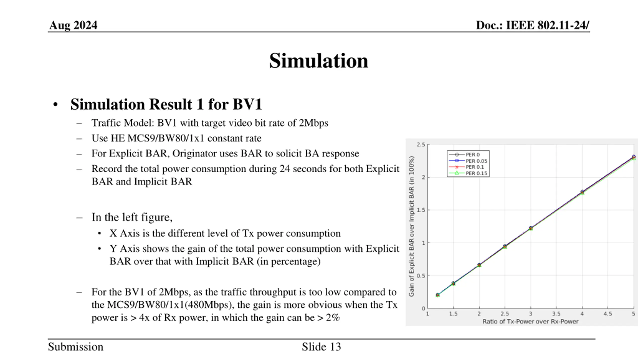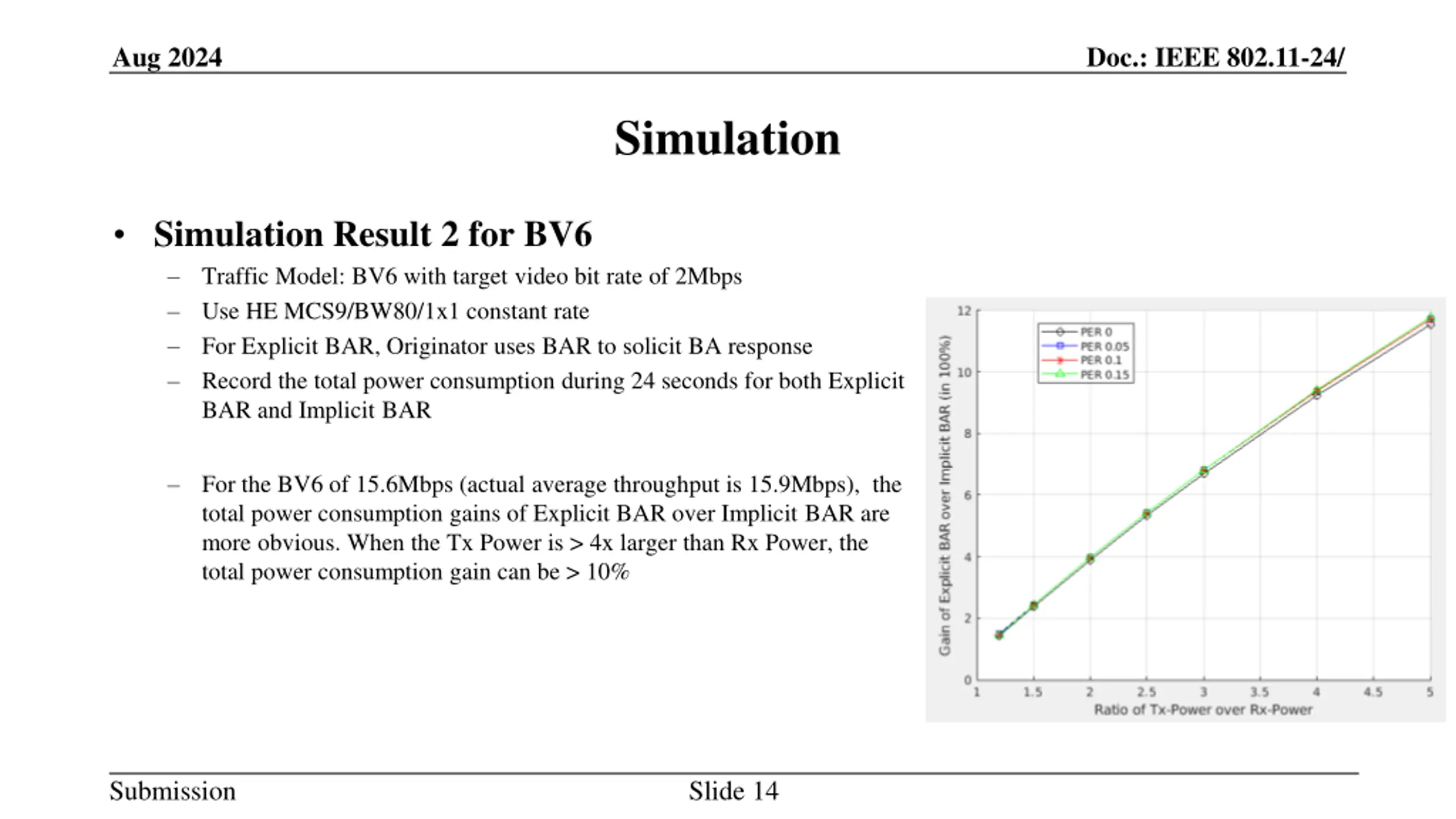 Aug 2024 Doc.: IEEE 802.11-24/ Simulation Simulation Result 1 for BV1 Traffic Model: BV1 with target video bit rate of 2Mbps Use HE MCS9/BW80/1x1 constant rate For Explicit BAR, Originator uses BAR to solicit BA response Record the total power consumption during 24 seconds for both Explicit BAR and Implicit BAR In the left figure, X Axis is the different level of Tx power consumption Y Axis shows the gain of the total power consumption with Explicit BAR over that with Implicit BAR (in percentage) For the BV1 of 2Mbps, as the traffic throughput is too low compared to the MCS9/BW80/1x1(480Mbps), the gain is more obvious when the Tx power is > 4x of Rx power, in which the gain can be > 2% Submission Slide 13