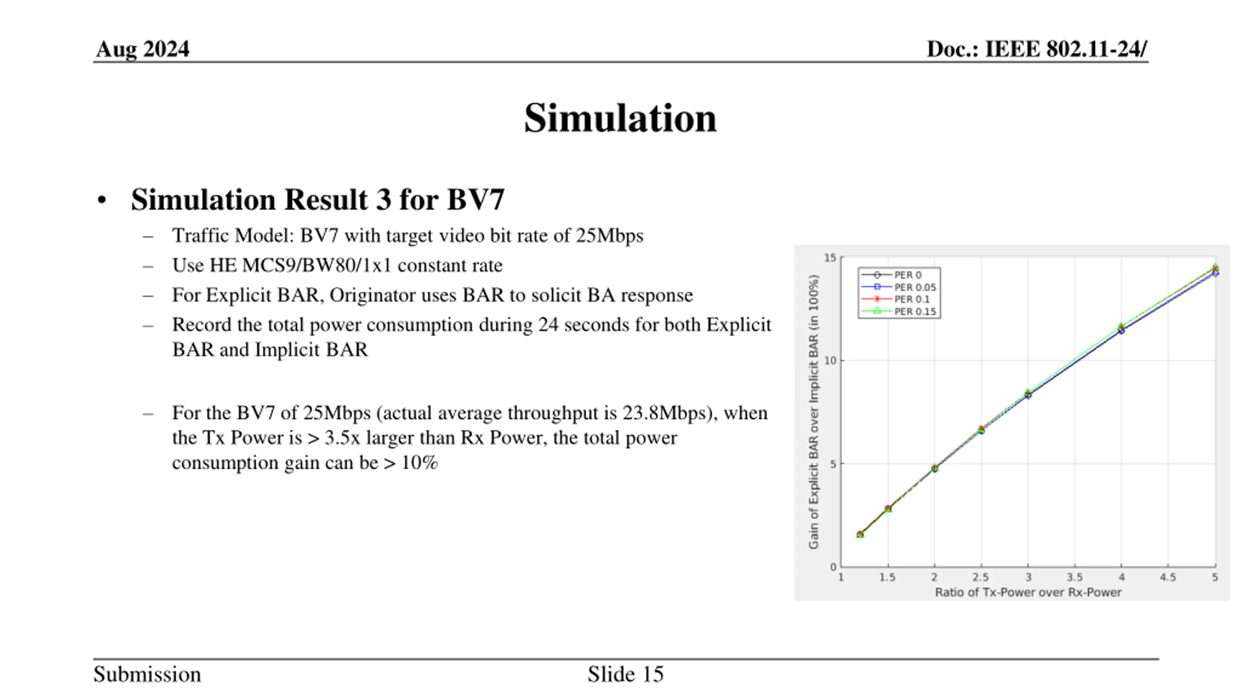 Aug 2024 Doc.: IEEE 802.11-24/ Simulation Simulation Result 2 for BV6 Traffic Model: BV6 with target video bit rate of 2Mbps Use HE MCS9/BW80/1x1 constant rate For Explicit BAR, Originator uses BAR to solicit BA response Record the total power consumption during 24 seconds for both Explicit BAR and Implicit BAR For the BV6 of 15.6Mbps (actual average throughput is 15.9Mbps), the total power consumption gains of Explicit BAR over Implicit BAR are more obvious. When the Tx Power is > 4x larger than Rx Power, the total power consumption gain can be > 10% Submission Slide 14