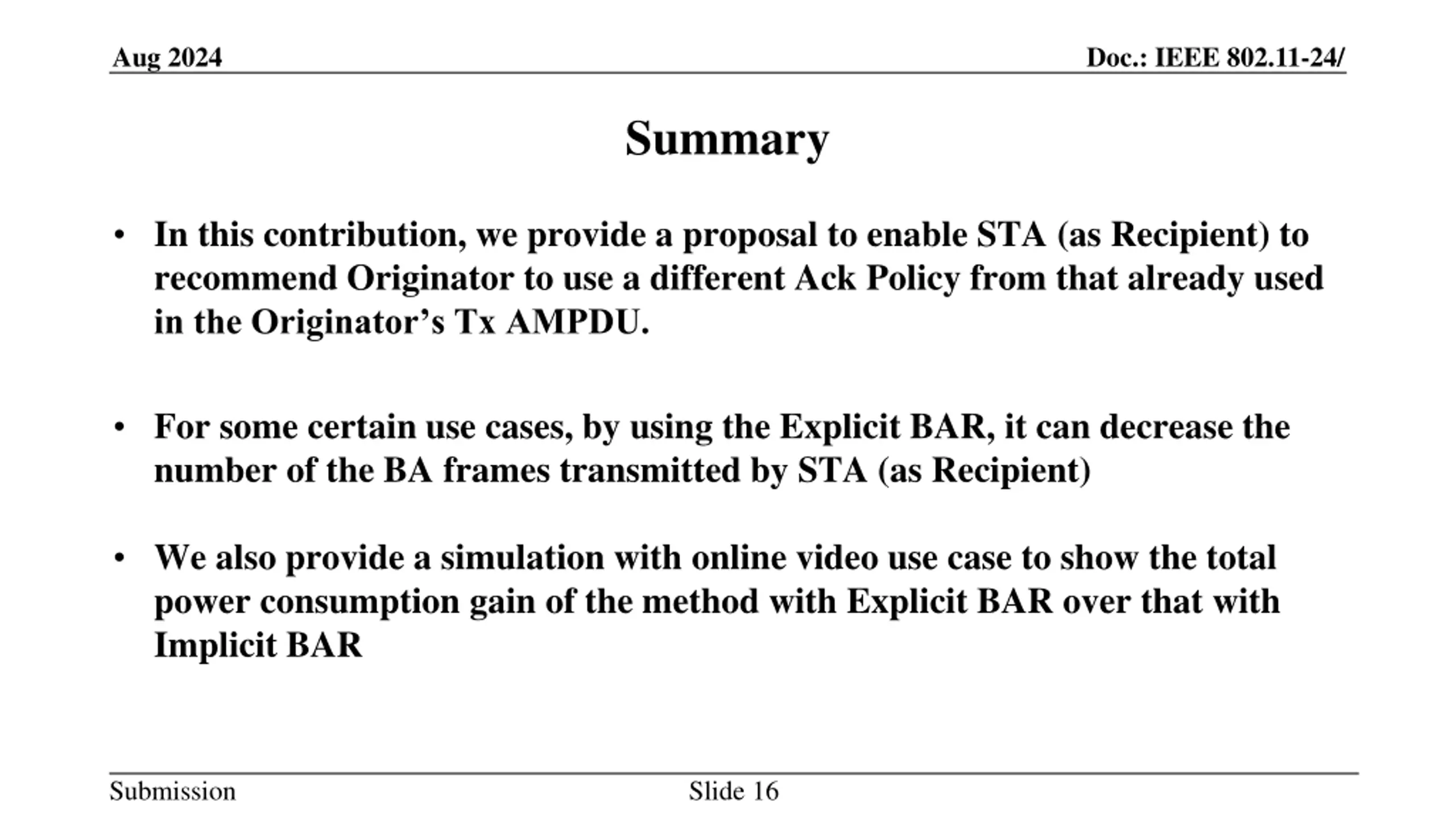 Aug 2024 Doc.: IEEE 802.11-24/ Summary In this contribution, we provide a proposal to enable STA (as Recipient) to recommend Originator to use a different Ack Policy from that already used in the Originator s Tx AMPDU. For some certain use cases, by using the Explicit BAR, it can decrease the number of the BA frames transmitted by STA (as Recipient) We also provide a simulation with online video use case to show the total power consumption gain of the method with Explicit BAR over that with Implicit BAR Submission Slide 16
