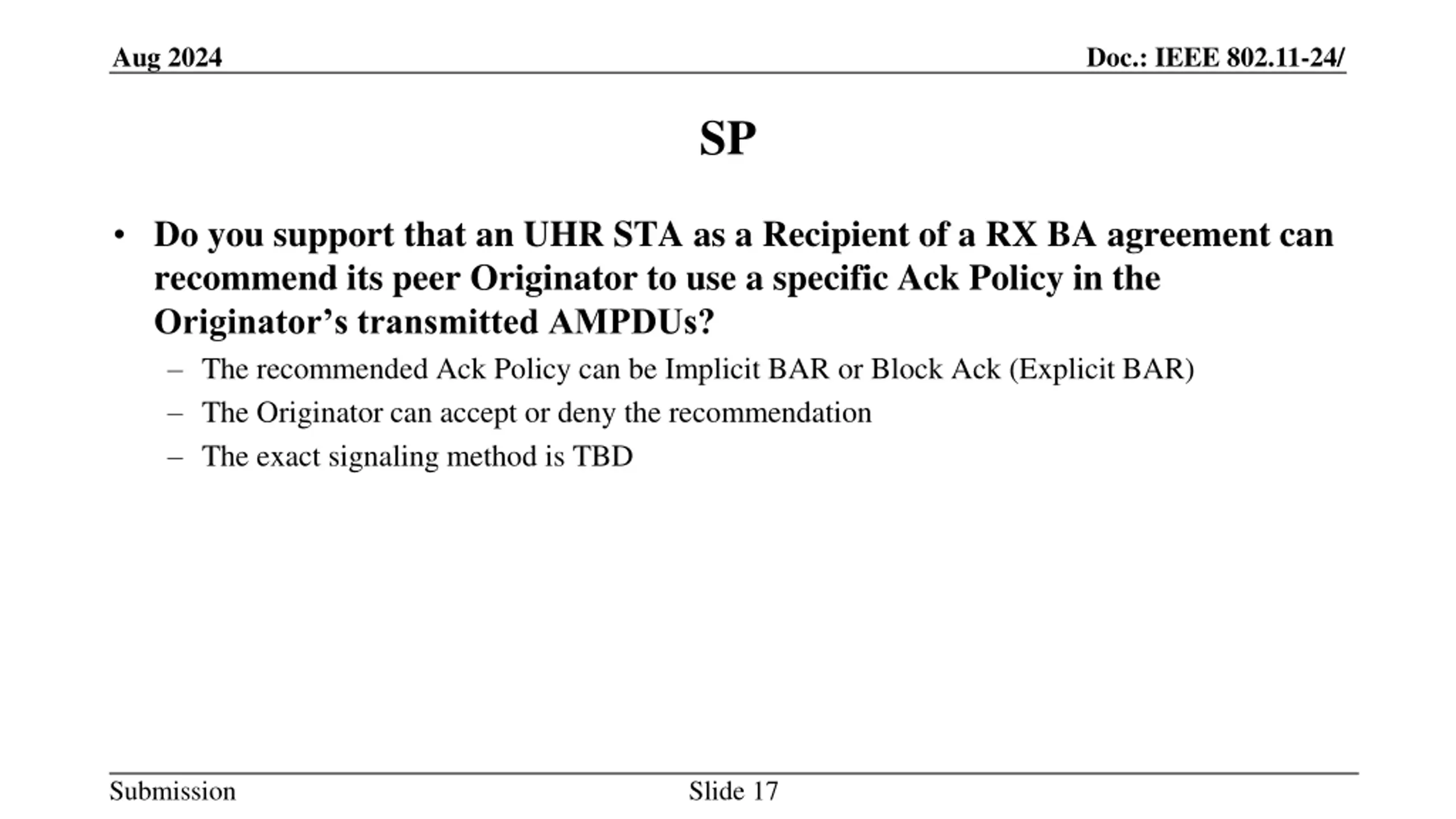 Aug 2024 Doc.: IEEE 802.11-24/ SP Do you support that an UHR STA as a Recipient of a RX BA agreement can recommend its peer Originator to use a specific Ack Policy in the Originator s transmitted AMPDUs? The recommended Ack Policy can be Implicit BAR or Block Ack (Explicit BAR) The Originator can accept or deny the recommendation The exact signaling method is TBD Submission Slide 17