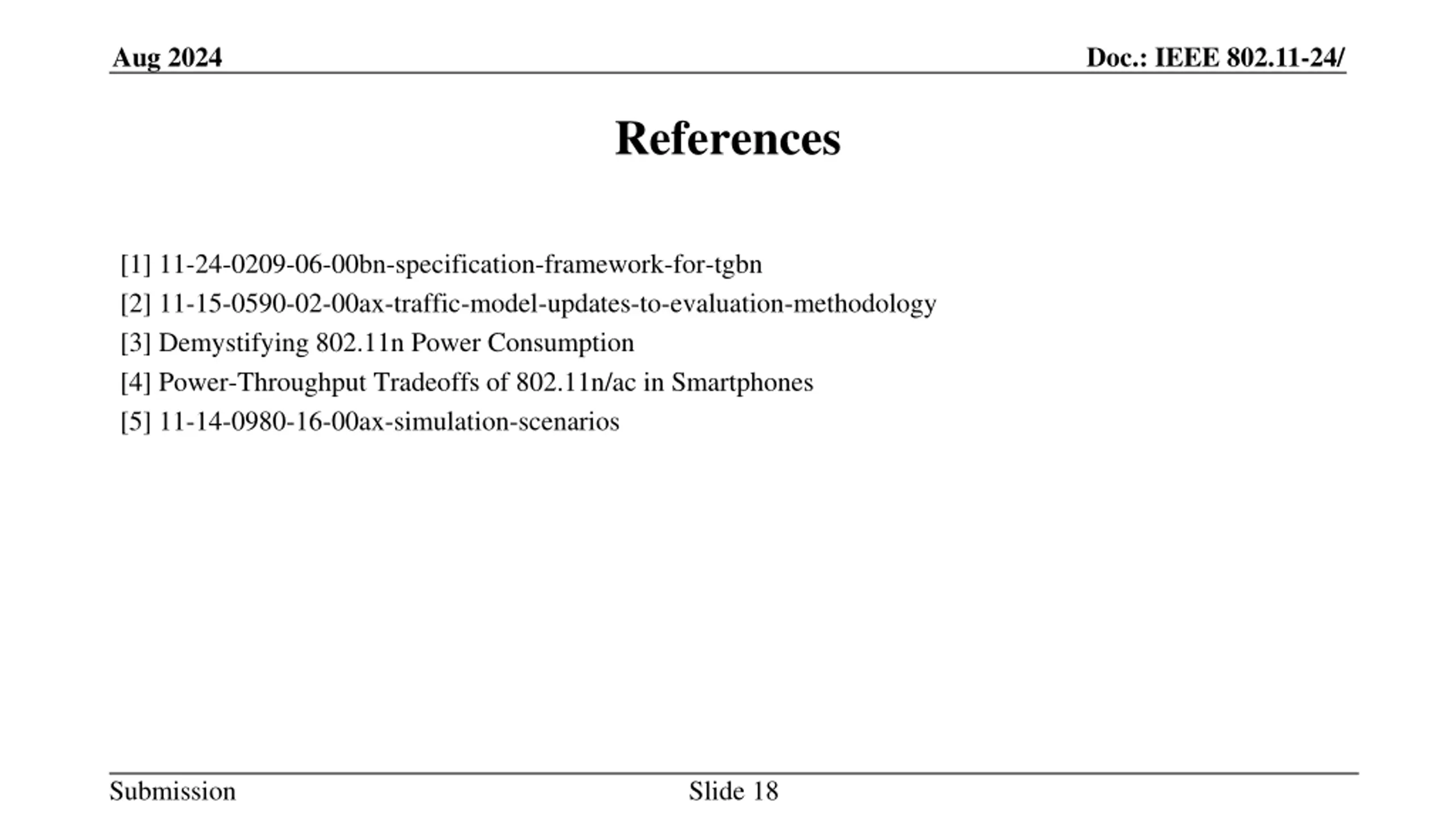 Aug 2024 Doc.: IEEE 802.11-24/ References [1] 11-24-0209-06-00bn-specification-framework-for-tgbn [2] 11-15-0590-02-00ax-traffic-model-updates-to-evaluation-methodology [3] Demystifying 802.11n Power Consumption [4] Power-Throughput Tradeoffs of 802.11n/ac in Smartphones [5] 11-14-0980-16-00ax-simulation-scenarios Submission Slide 18