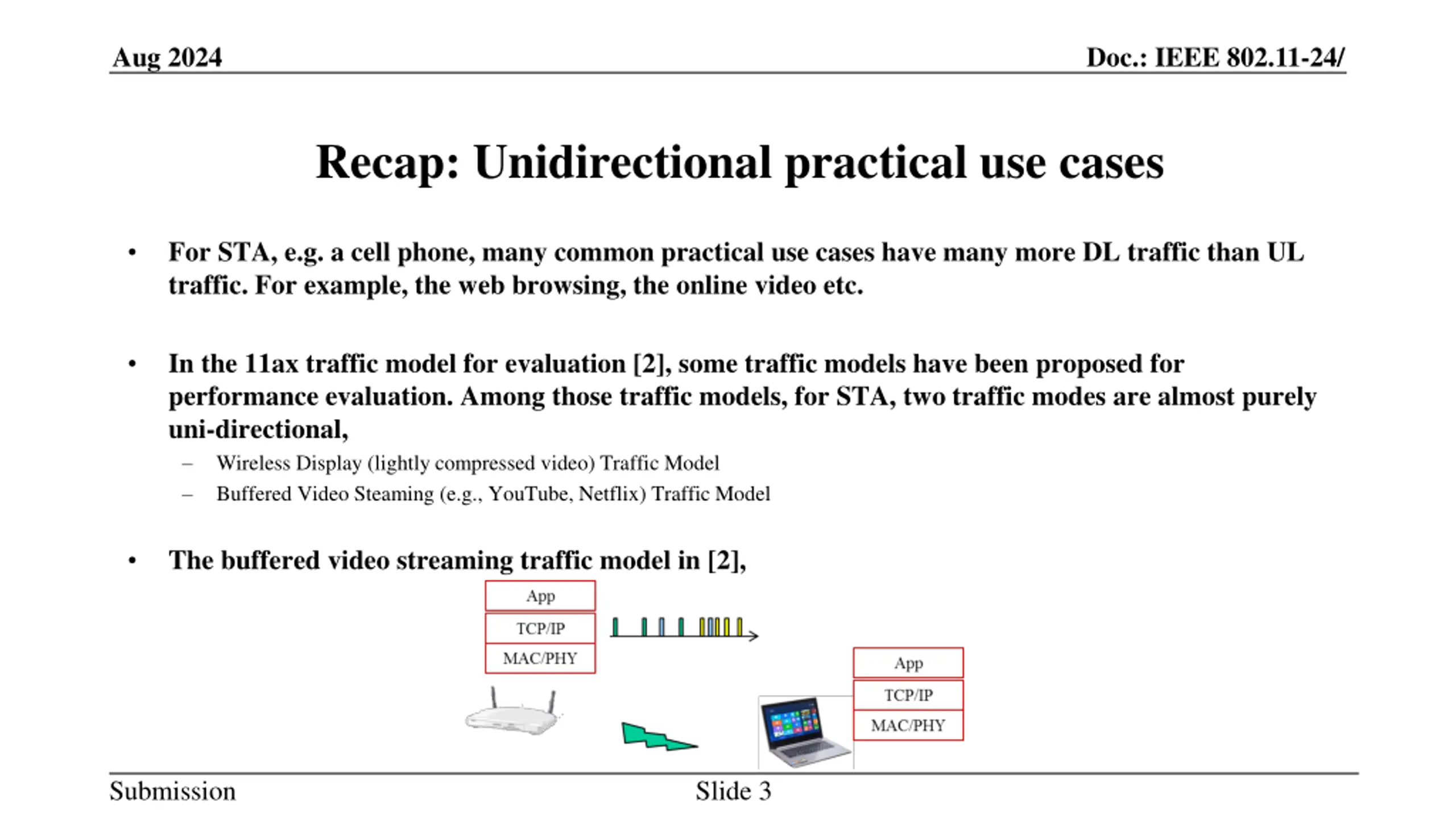 Aug 2024 Doc.: IEEE 802.11-24/ Recap: Unidirectional practical use cases For STA, e.g. a cell phone, many common practical use cases have many more DL traffic than UL traffic. For example, the web browsing, the online video etc. In the 11ax traffic model for evaluation [2], some traffic models have been proposed for performance evaluation. Among those traffic models, for STA, two traffic modes are almost purely uni-directional, Wireless Display (lightly compressed video) Traffic Model Buffered Video Steaming (e.g., YouTube, Netflix) Traffic Model The buffered video streaming traffic model in [2], Submission Slide 3