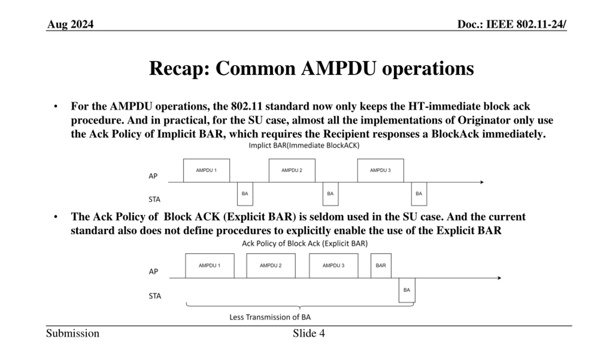 Aug 2024 Doc.: IEEE 802.11-24/ Recap: Common AMPDU operations For the AMPDU operations, the 802.11 standard now only keeps the HT-immediate block ack procedure. And in practical, for the SU case, almost all the implementations of Originator only use the Ack Policy of Implicit BAR, which requires the Recipient responses a BlockAck immediately. The Ack Policy of Block ACK (Explicit BAR) is seldom used in the SU case. And the current standard also does not define procedures to explicitly enable the use of the Explicit BAR Submission Slide 4