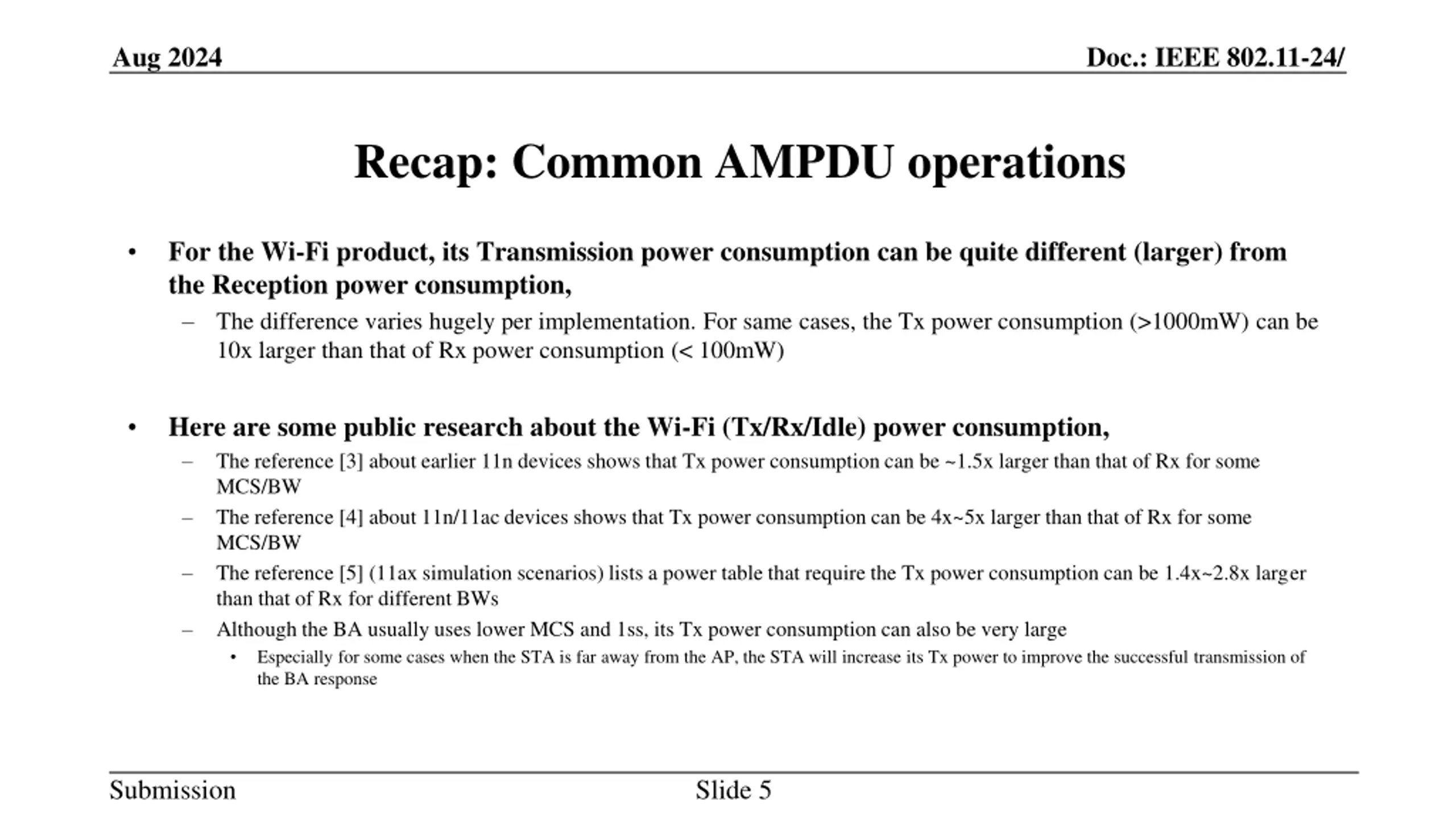 Aug 2024 Doc.: IEEE 802.11-24/ Recap: Common AMPDU operations For the Wi-Fi product, its Transmission power consumption can be quite different (larger) from the Reception power consumption, The difference varies hugely per implementation. For same cases, the Tx power consumption (>1000mW) can be 10x larger than that of Rx power consumption (< 100mW) Here are some public research about the Wi-Fi (Tx/Rx/Idle) power consumption, The reference [3] about earlier 11n devices shows that Tx power consumption can be ~1.5x larger than that of Rx for some MCS/BW The reference [4] about 11n/11ac devices shows that Tx power consumption can be 4x~5x larger than that of Rx for some MCS/BW The reference [5] (11ax simulation scenarios) lists a power table that require the Tx power consumption can be 1.4x~2.8x larger than that of Rx for different BWs Although the BA usually uses lower MCS and 1ss, its Tx power consumption can also be very large Especially for some cases when the STA is far away from the AP, the STA will increase its Tx power to improve the successful transmission of the BA response Submission Slide 5