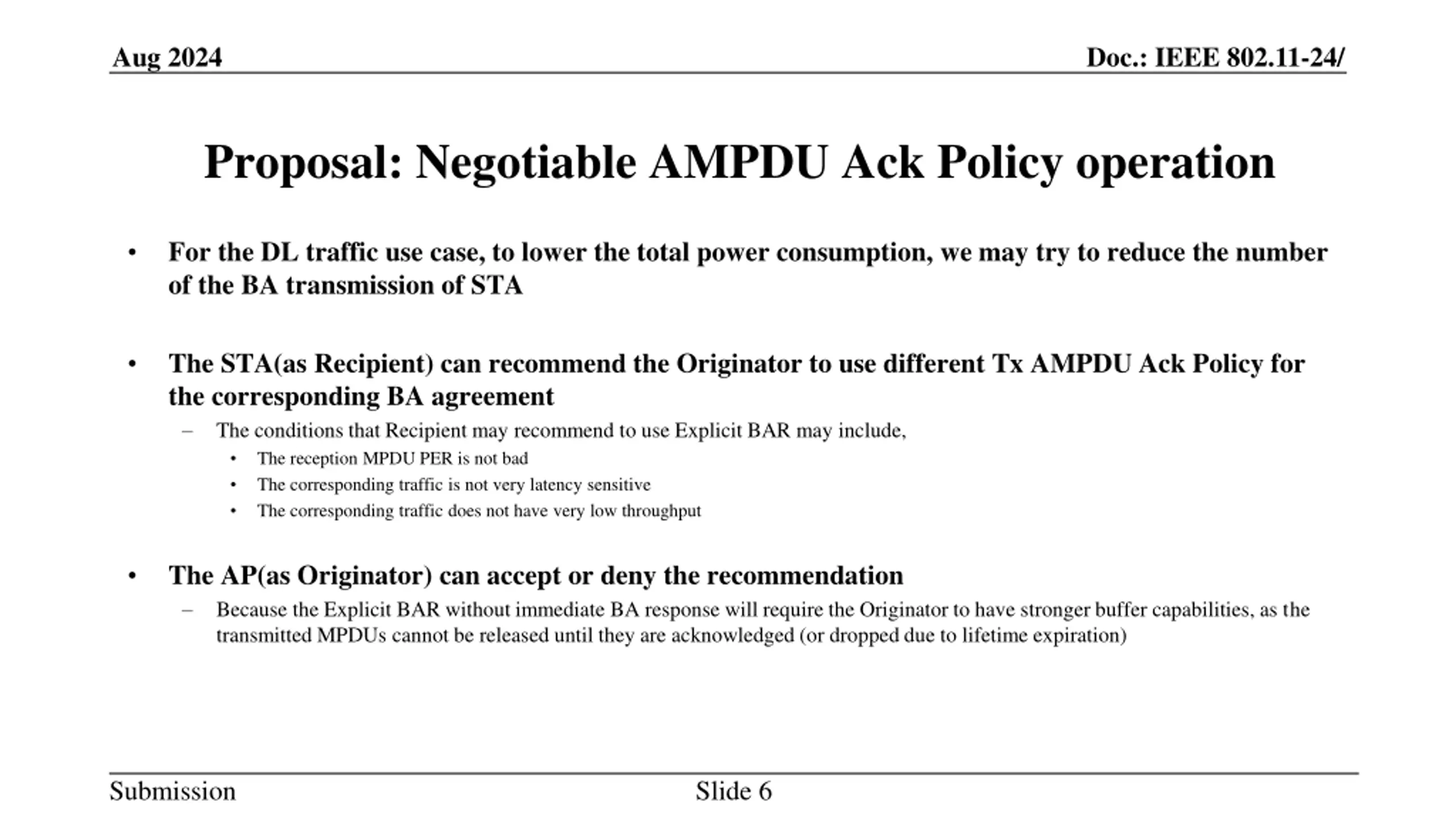 Aug 2024 Doc.: IEEE 802.11-24/ Proposal: Negotiable AMPDU Ack Policy operation For the DL traffic use case, to lower the total power consumption, we may try to reduce the number of the BA transmission of STA The STA(as Recipient) can recommend the Originator to use different Tx AMPDU Ack Policy for the corresponding BA agreement The conditions that Recipient may recommend to use Explicit BAR may include, The reception MPDU PER is not bad The corresponding traffic is not very latency sensitive The corresponding traffic does not have very low throughput The AP(as Originator) can accept or deny the recommendation Because the Explicit BAR without immediate BA response will require the Originator to have stronger buffer capabilities, as the transmitted MPDUs cannot be released until they are acknowledged (or dropped due to lifetime expiration) Submission Slide 6