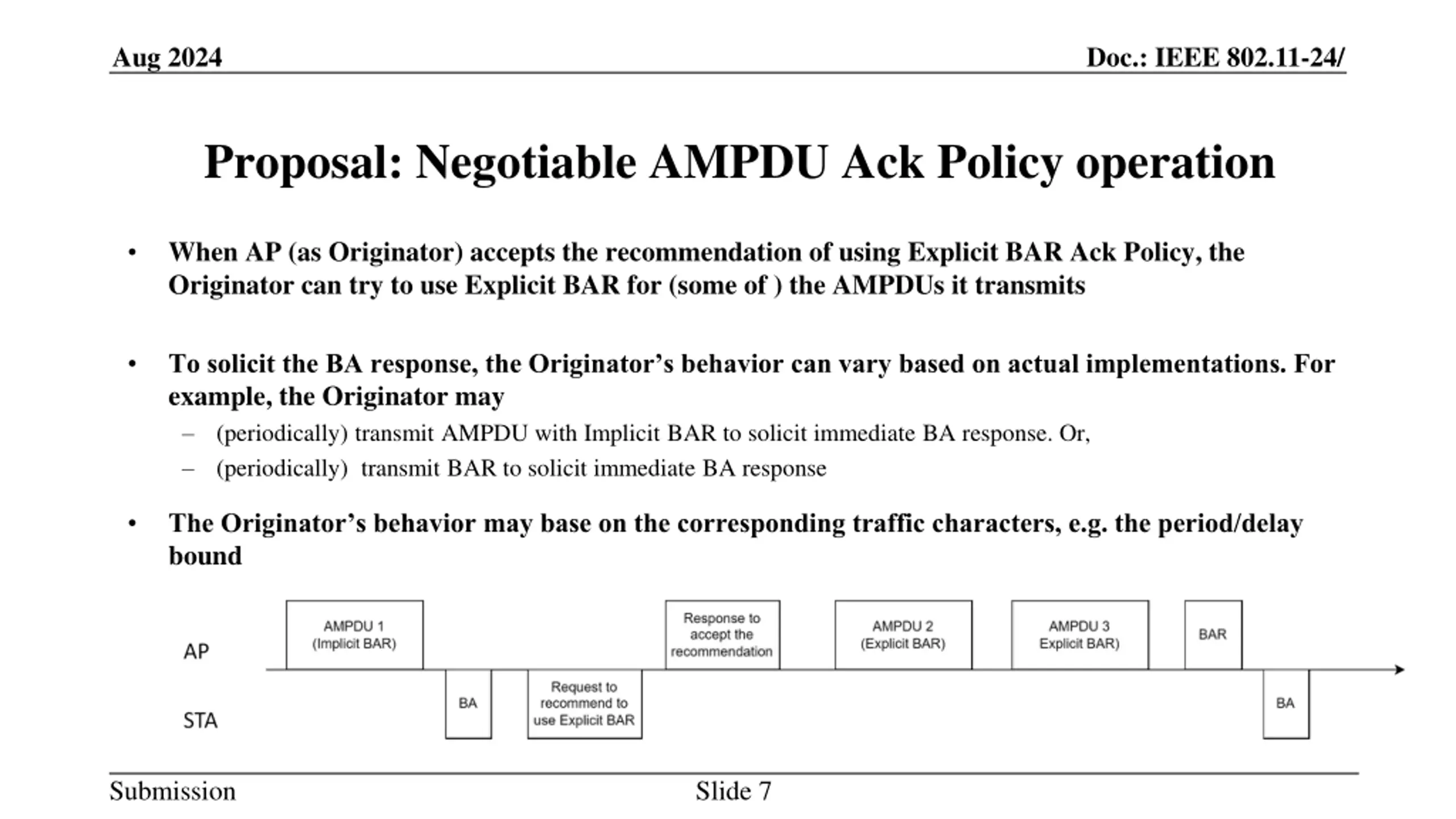 Aug 2024 Doc.: IEEE 802.11-24/ Proposal: Negotiable AMPDU Ack Policy operation When AP (as Originator) accepts the recommendation of using Explicit BAR Ack Policy, the Originator can try to use Explicit BAR for (some of ) the AMPDUs it transmits To solicit the BA response, the Originator s behavior can vary based on actual implementations. For example, the Originator may (periodically) transmit AMPDU with Implicit BAR to solicit immediate BA response. Or, (periodically) transmit BAR to solicit immediate BA response The Originator s behavior may base on the corresponding traffic characters, e.g. the period/delay bound Submission Slide 7