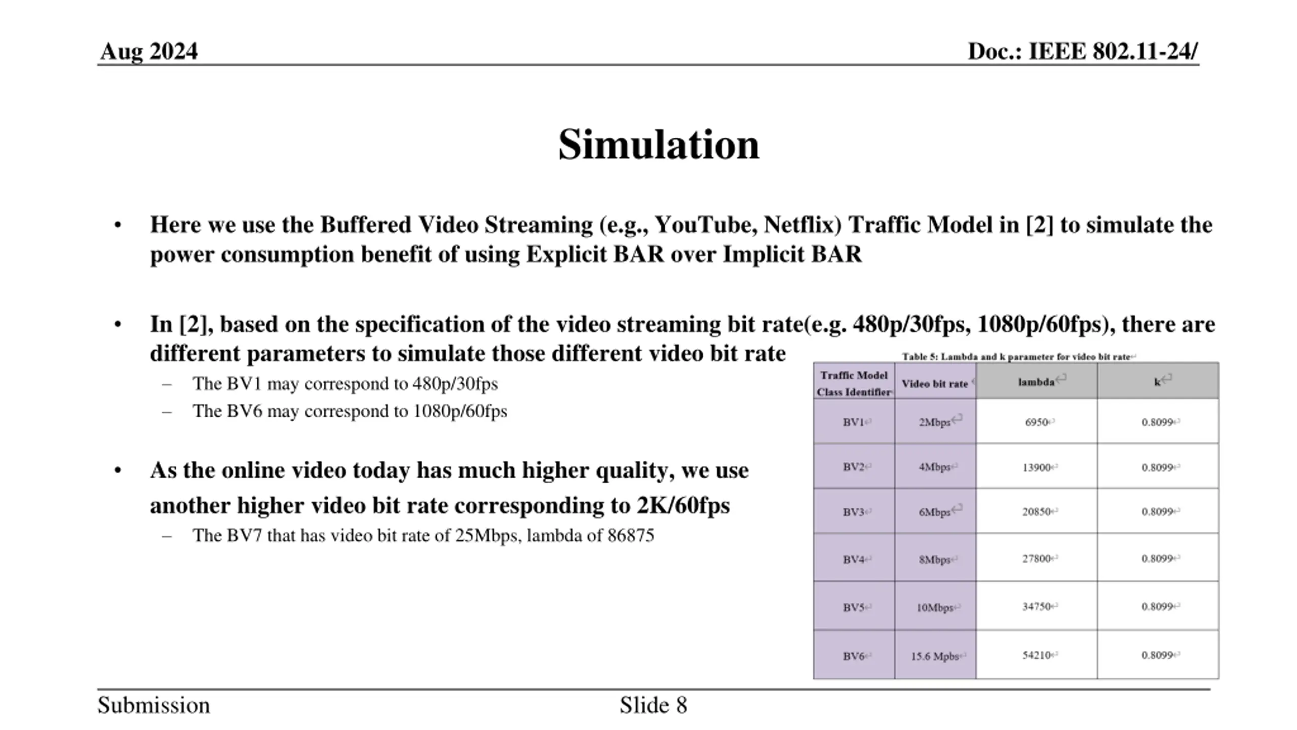 Aug 2024 Doc.: IEEE 802.11-24/ Simulation Here we use the Buffered Video Streaming (e.g., YouTube, Netflix) Traffic Model in [2] to simulate the power consumption benefit of using Explicit BAR over Implicit BAR In [2], based on the specification of the video streaming bit rate(e.g. 480p/30fps, 1080p/60fps), there are different parameters to simulate those different video bit rate The BV1 may correspond to 480p/30fps The BV6 may correspond to 1080p/60fps As the online video today has much higher quality, we use another higher video bit rate corresponding to 2K/60fps The BV7 that has video bit rate of 25Mbps, lambda of 86875 Submission Slide 8