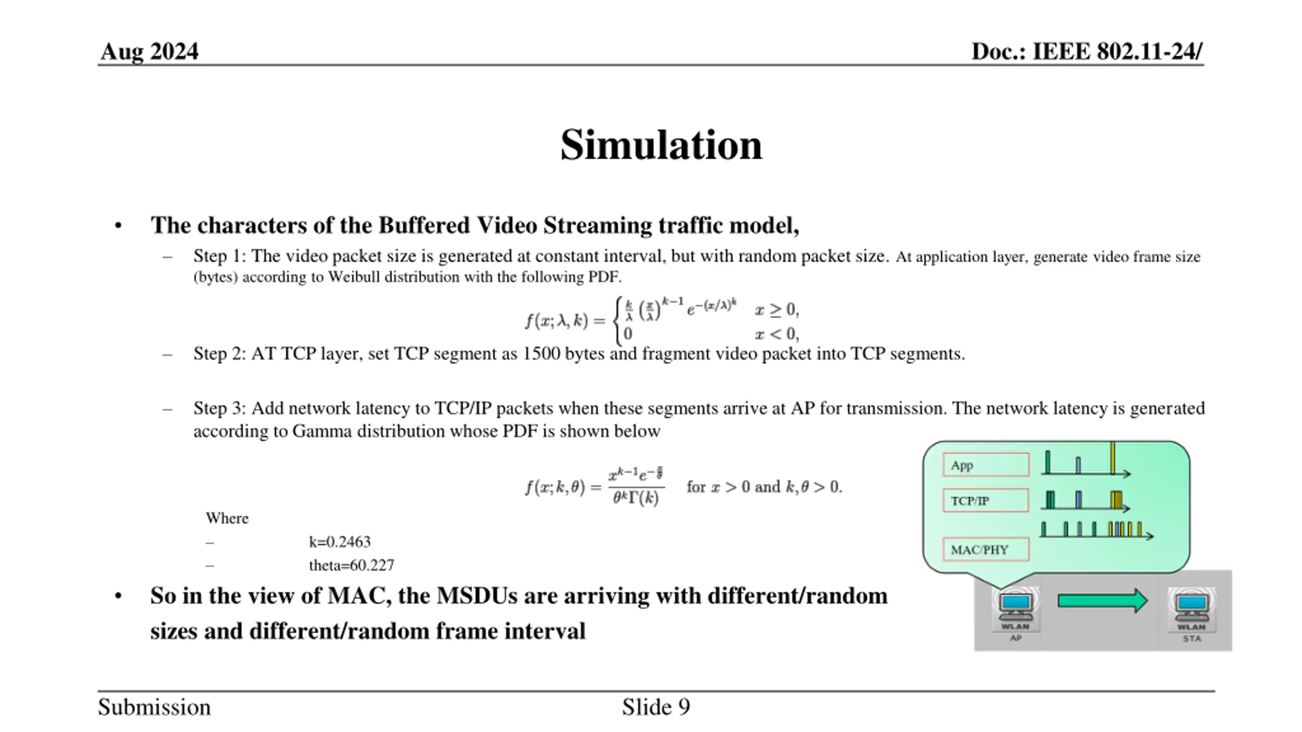 Aug 2024 Doc.: IEEE 802.11-24/ Simulation The characters of the Buffered Video Streaming traffic model, Step 1: The video packet size is generated at constant interval, but with random packet size. At application layer, generate video frame size (bytes) according to Weibull distribution with the following PDF. Step 2: AT TCP layer, set TCP segment as 1500 bytes and fragment video packet into TCP segments. Step 3: Add network latency to TCP/IP packets when these segments arrive at AP for transmission. The network latency is generated according to Gamma distribution whose PDF is shown below Where k=0.2463 theta=60.227 So in the view of MAC, the MSDUs are arriving with different/random sizes and different/random frame interval Submission Slide 9