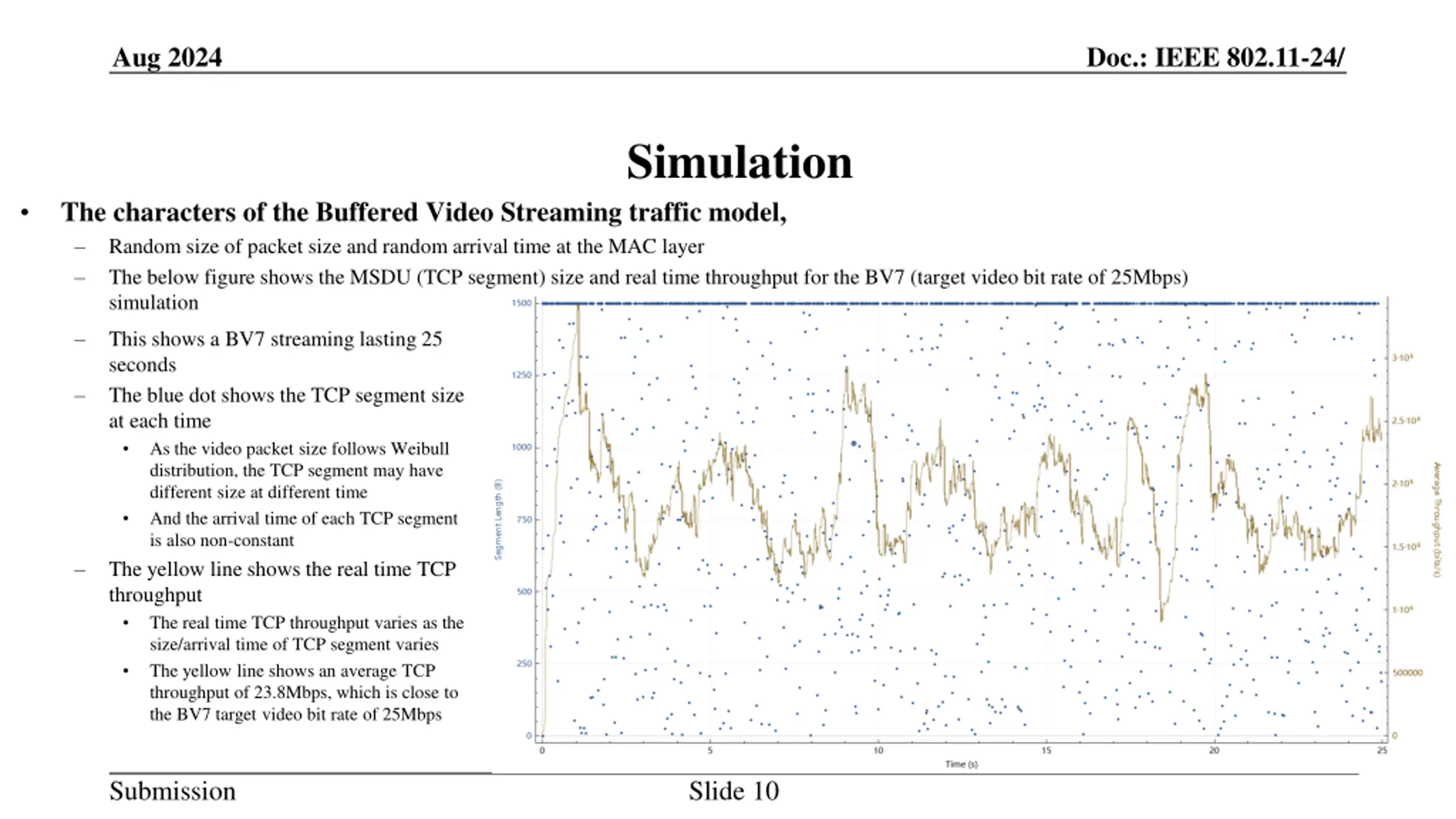 Aug 2024 Doc.: IEEE 802.11-24/ Simulation The characters of the Buffered Video Streaming traffic model, Random size of packet size and random arrival time at the MAC layer The below figure shows the MSDU (TCP segment) size and real time throughput for the BV7 (target video bit rate of 25Mbps) simulation This shows a BV7 streaming lasting 25 seconds The blue dot shows the TCP segment size at each time As the video packet size follows Weibull distribution, the TCP segment may have different size at different time And the arrival time of each TCP segment is also non-constant The yellow line shows the real time TCP throughput The real time TCP throughput varies as the size/arrival time of TCP segment varies The yellow line shows an average TCP throughput of 23.8Mbps, which is close to the BV7 target video bit rate of 25Mbps Submission Slide 10