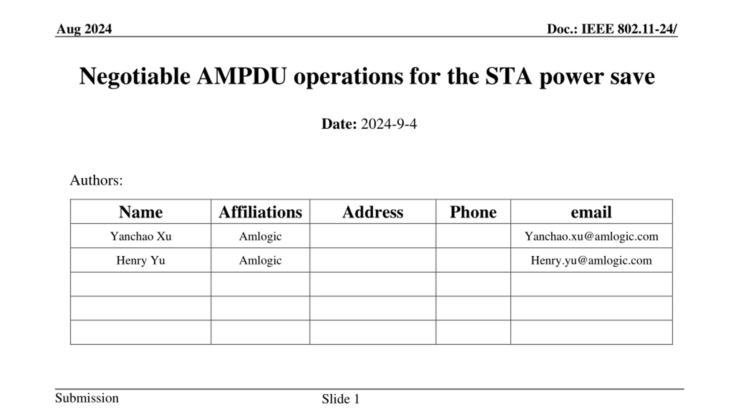 Aug 2024 Doc.: IEEE 802.11-24/ Negotiable AMPDU operations for the STA power save Date: 2024-9-4 Authors: Name Affiliations Address Phone email Yanchao Xu Amlogic Yanchao.xu@amlogic.com Henry Yu Amlogic Henry.yu@amlogic.com Submission Slide 1
