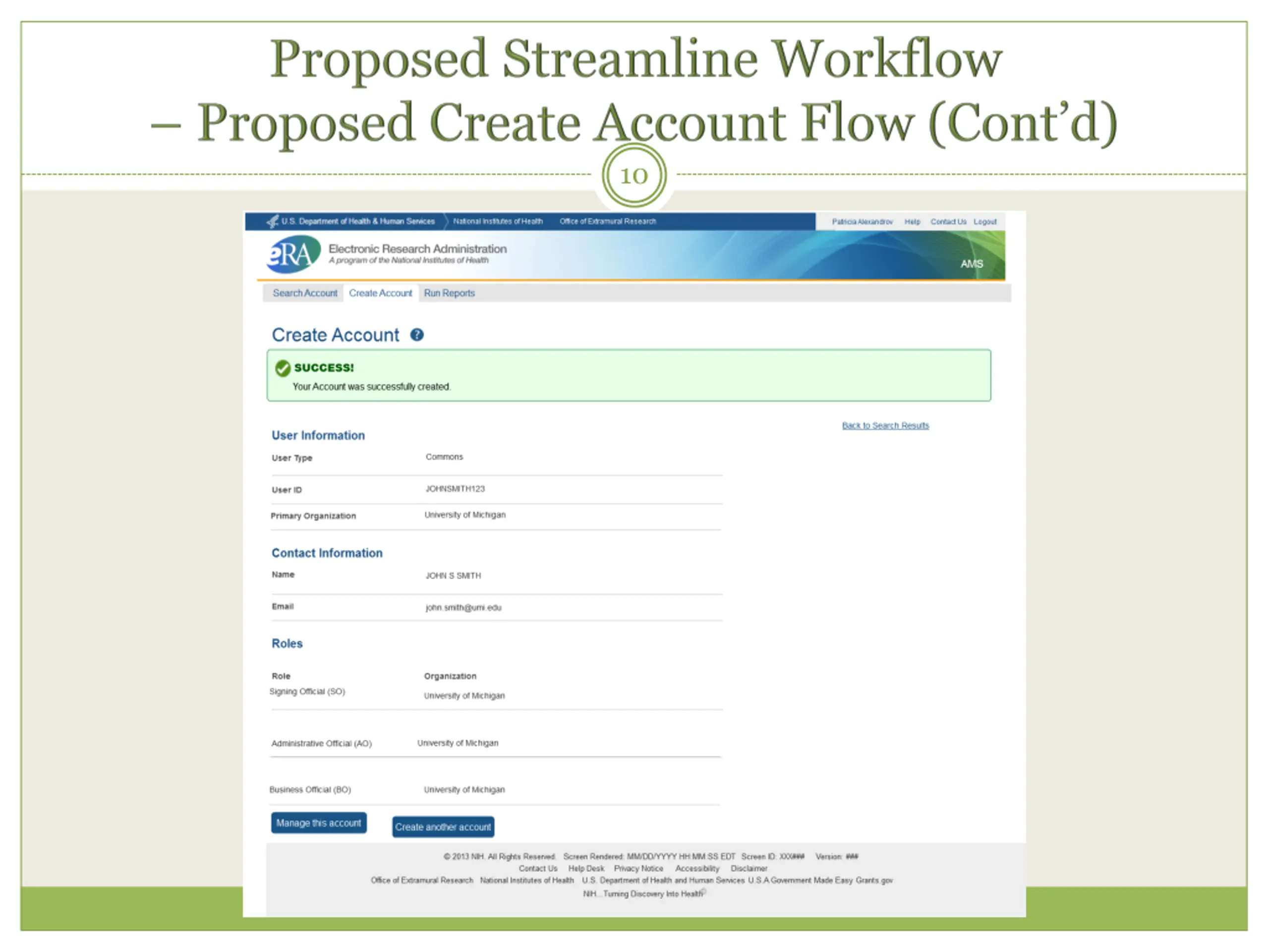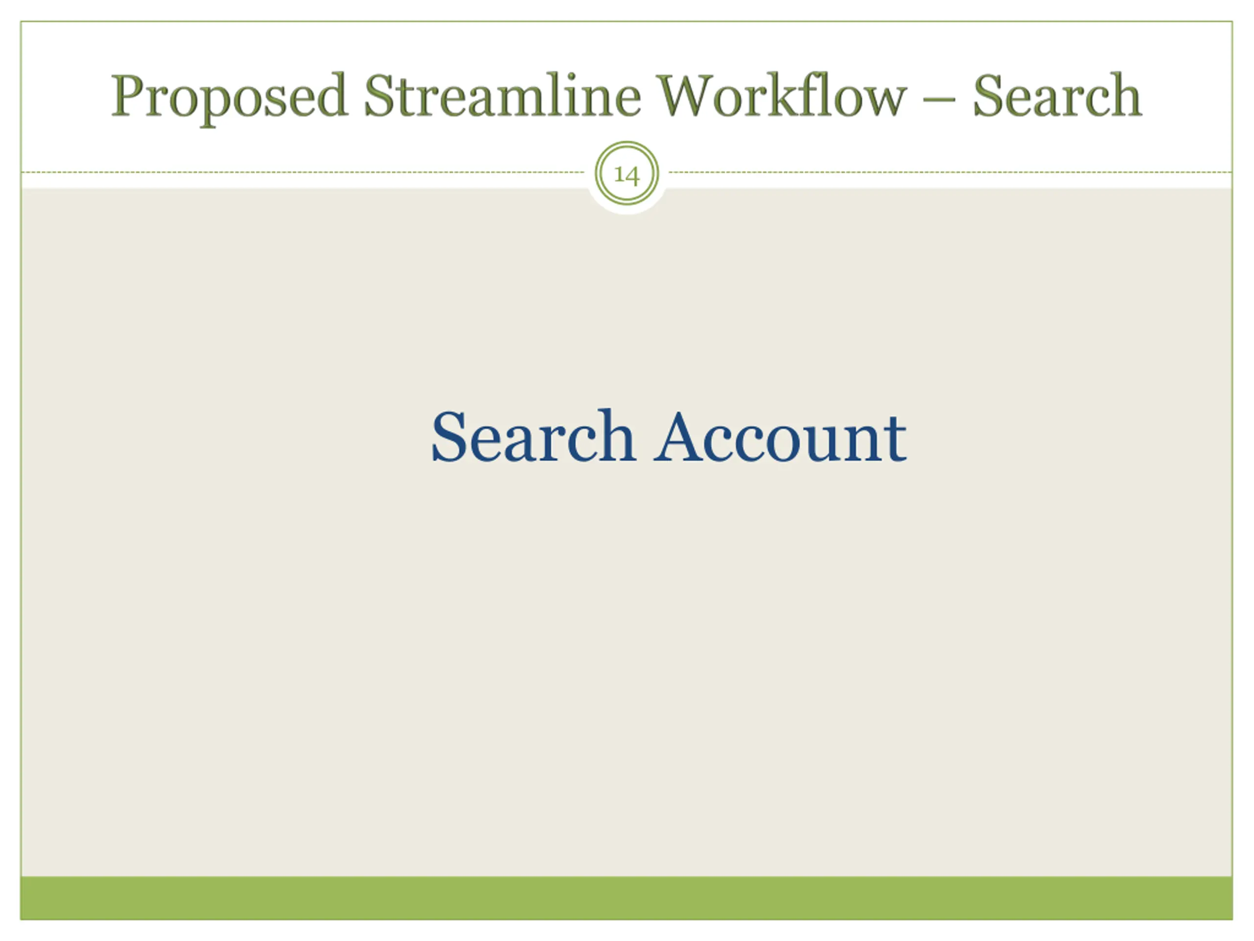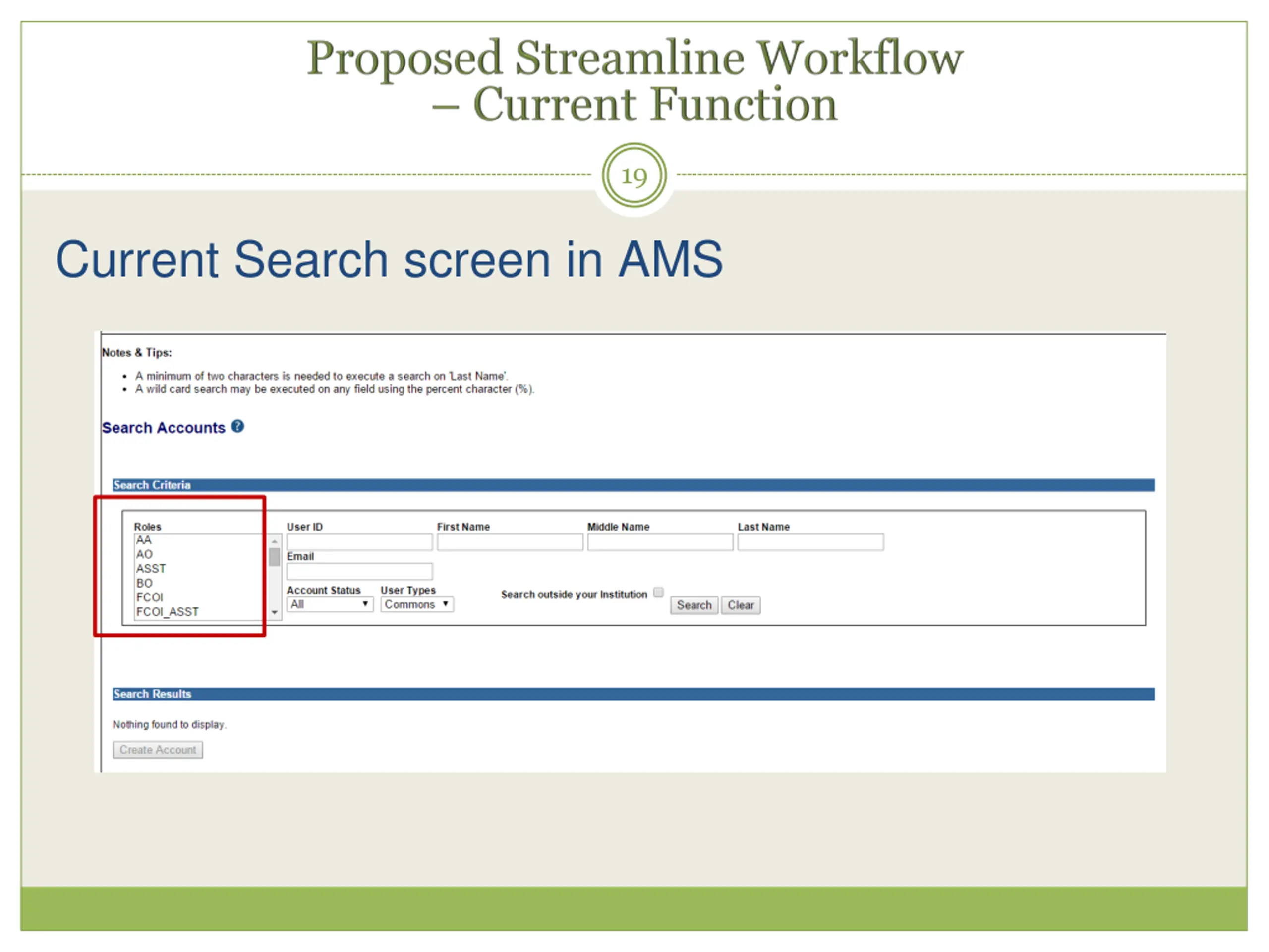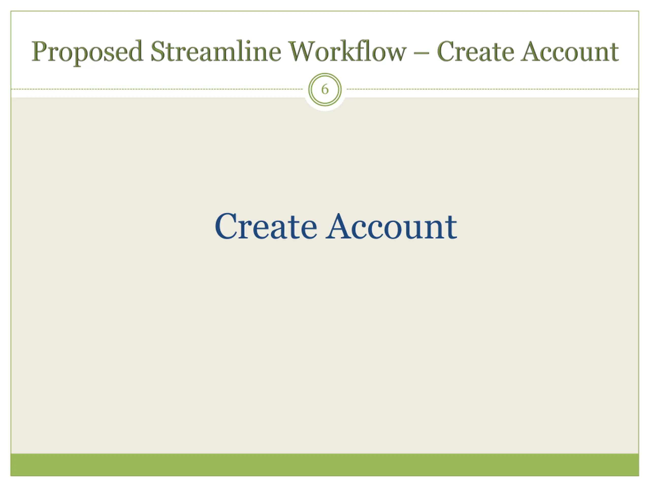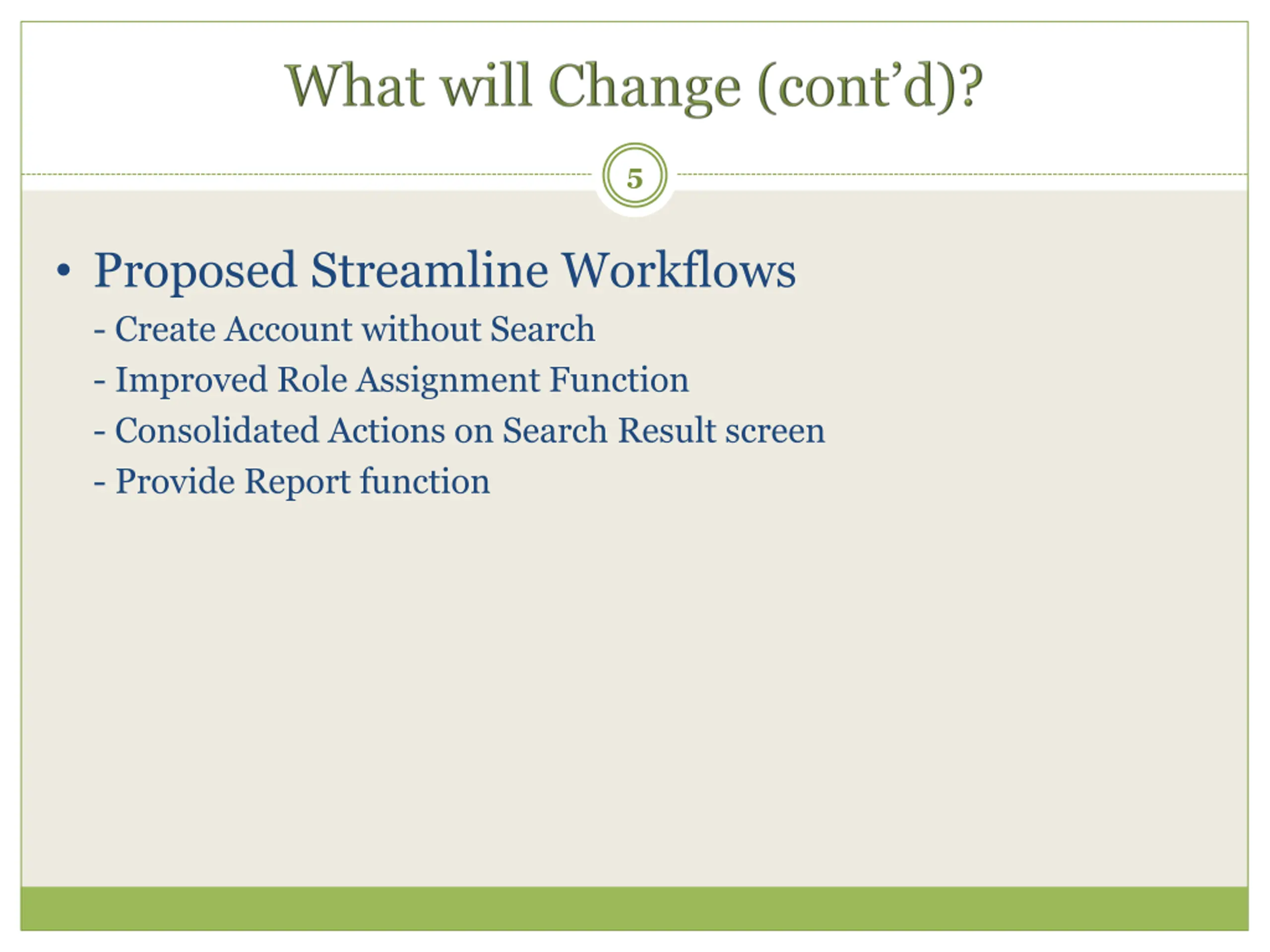 5 Proposed Streamline Workflows - Create Account without Search - Improved Role Assignment Function - Consolidated Actions on Search Result screen - Provide Report function