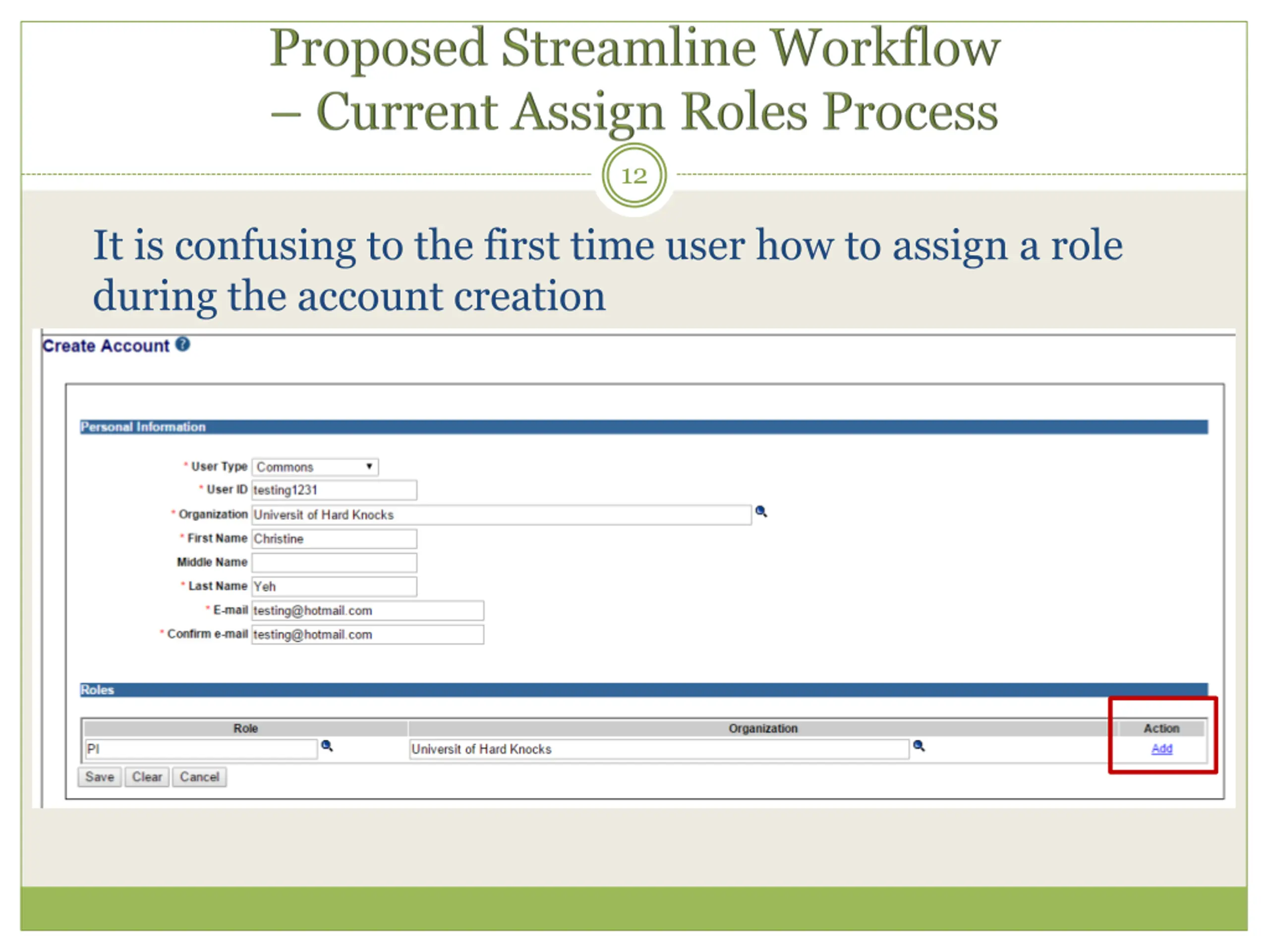 12 It is confusing to the first time user how to assign a role during the account creation