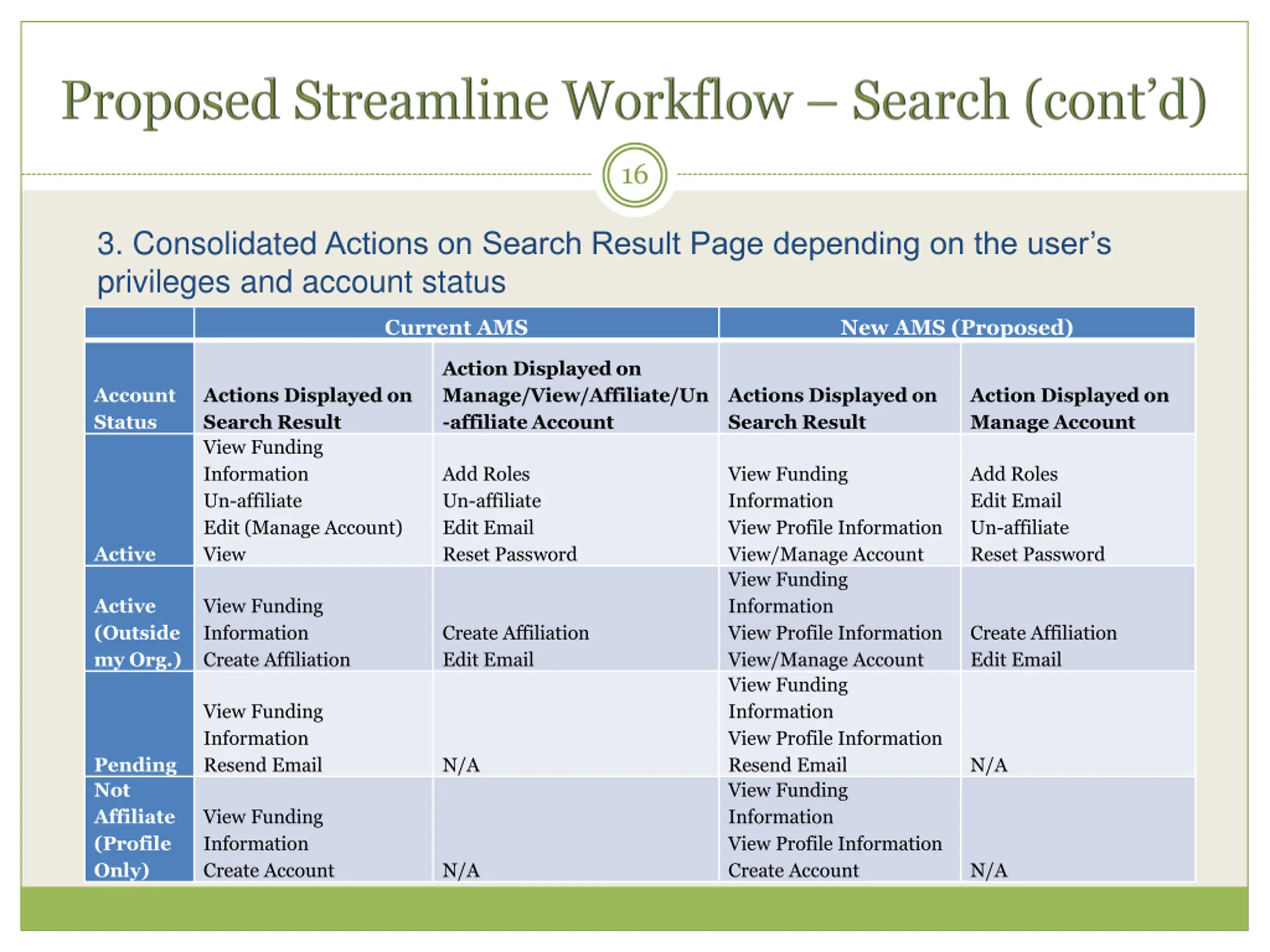 16 3. Consolidated Actions on Search Result Page depending on the user s privileges and account status Current AMS New AMS (Proposed) Action Displayed on Manage/View/Affiliate/Un -affiliate Account Account Status Actions Displayed on Search Result View Funding Information Un-affiliate Edit (Manage Account) View Actions Displayed on Search Result Action Displayed on Manage Account Add Roles Un-affiliate Edit Email Reset Password View Funding Information View Profile Information View/Manage Account View Funding Information View Profile Information View/Manage Account View Funding Information View Profile Information Resend Email View Funding Information View Profile Information Create Account Add Roles Edit Email Un-affiliate Reset Password Active Active (Outside my Org.) View Funding Information Create Affiliation Create Affiliation Edit Email Create Affiliation Edit Email View Funding Information Resend Email Pending Not Affiliate (Profile Only) N/A N/A View Funding Information Create Account N/A N/A