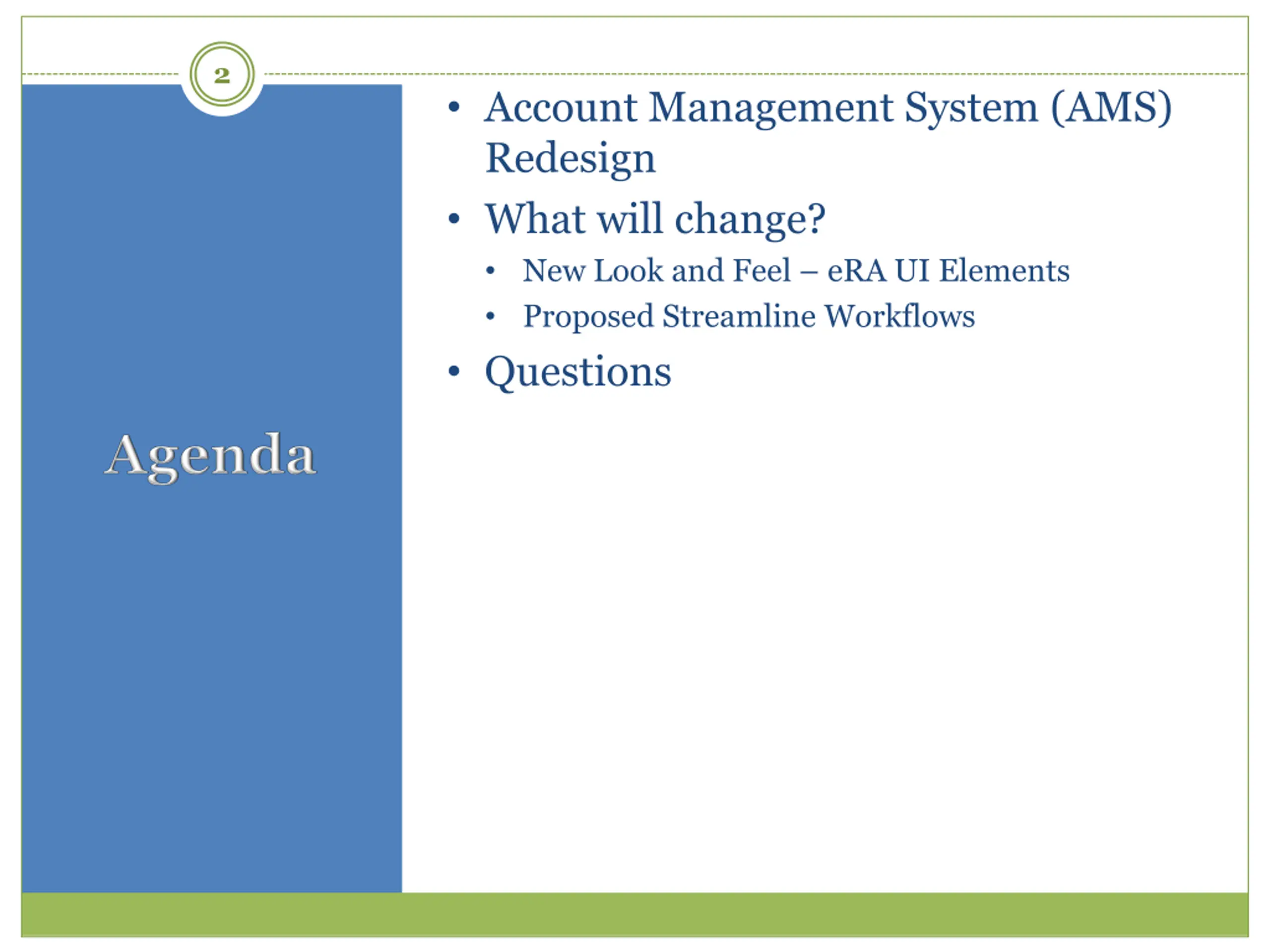 2 Account Management System (AMS) Redesign What will change? New Look and Feel eRA UI Elements Proposed Streamline Workflows Questions