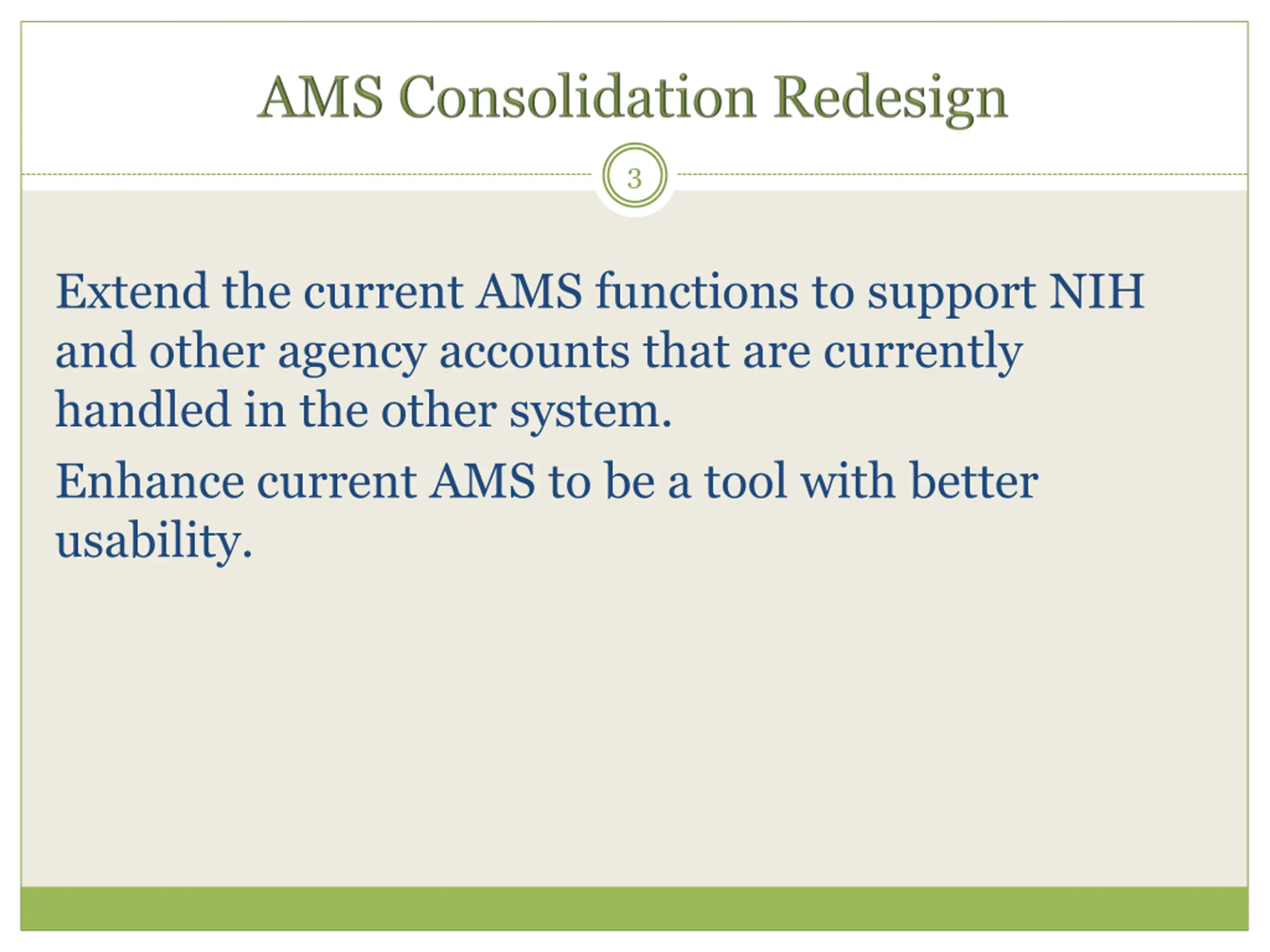 3 Extend the current AMS functions to support NIH and other agency accounts that are currently handled in the other system. Enhance current AMS to be a tool with better usability.