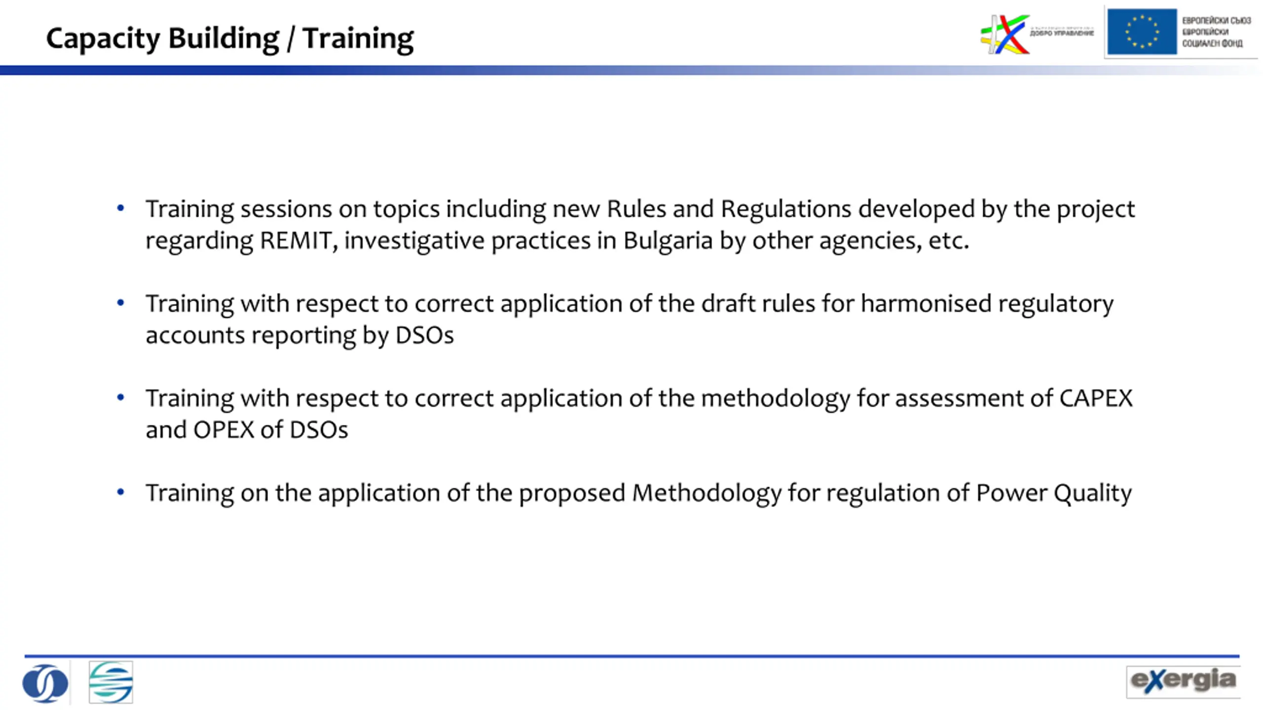 Capacity Building / Training Training sessions on topics including new Rules and Regulations developed by the project regarding REMIT, investigative practices in Bulgaria by other agencies, etc. Training with respect to correct application of the draft rules for harmonised regulatory accounts reporting by DSOs Training with respect to correct application of the methodology for assessment of CAPEX and OPEX of DSOs Training on the application of the proposed Methodology for regulation of Power Quality