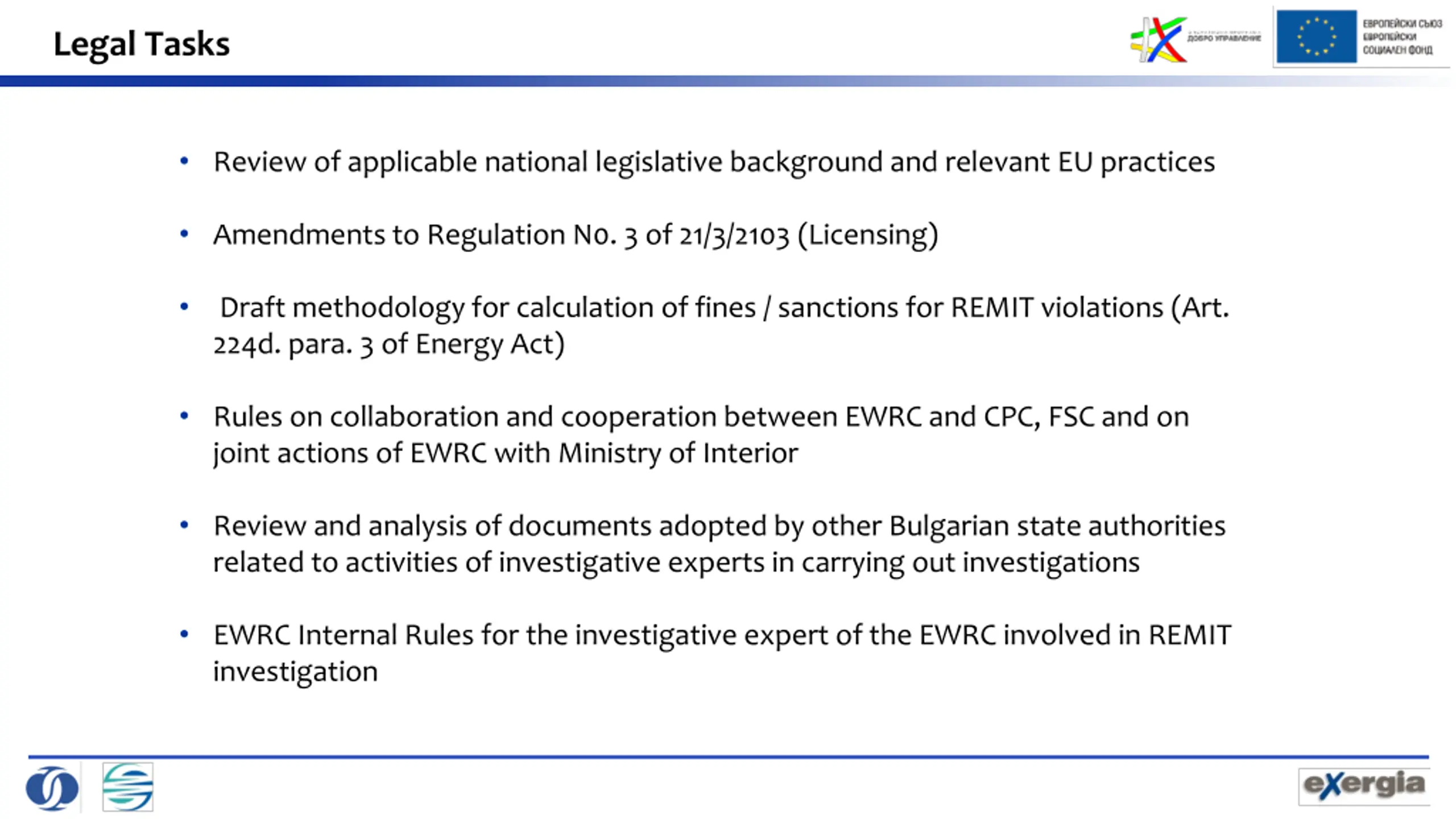 Legal Tasks Review of applicable national legislative background and relevant EU practices Amendments to Regulation N0. 3 of 21/3/2103 (Licensing) Draft methodology for calculation of fines / sanctions for REMIT violations (Art. 224d. para. 3 of Energy Act) Rules on collaboration and cooperation between EWRC and CPC, FSC and on joint actions of EWRC with Ministry of Interior Review and analysis of documents adopted by other Bulgarian state authorities related to activities of investigative experts in carrying out investigations EWRC Internal Rules for the investigative expert of the EWRC involved in REMIT investigation