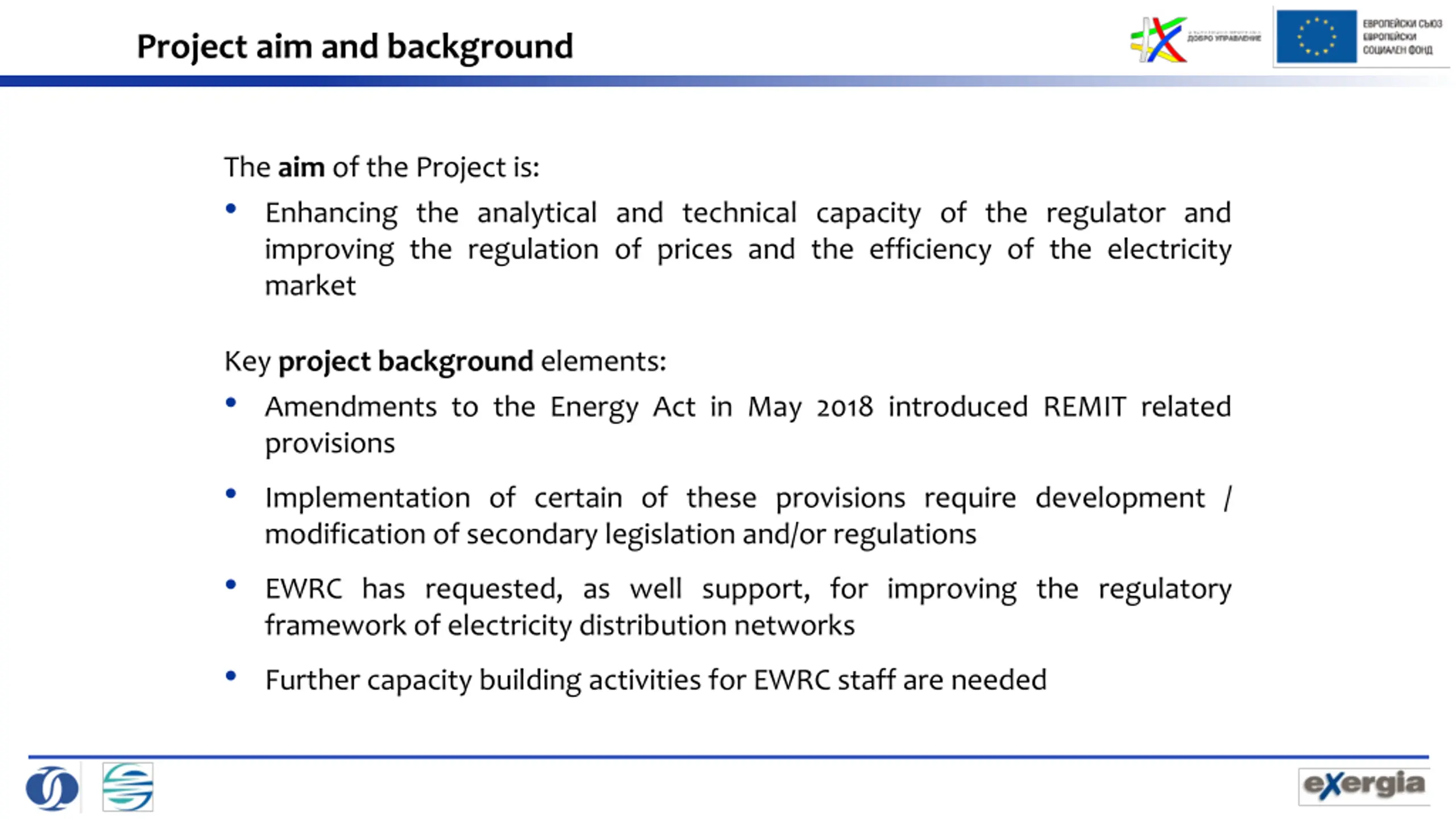 Project aim and background The aim of the Project is: Enhancing the analytical and technical capacity of the regulator and improving the regulation of prices and the efficiency of the electricity market Key project background elements: Amendments to the Energy Act in May 2018 introduced REMIT related provisions Implementation of certain of these provisions require development / modification of secondary legislation and/or regulations EWRC has requested, as well support, for improving the regulatory framework of electricity distribution networks Further capacity building activities for EWRC staff are needed