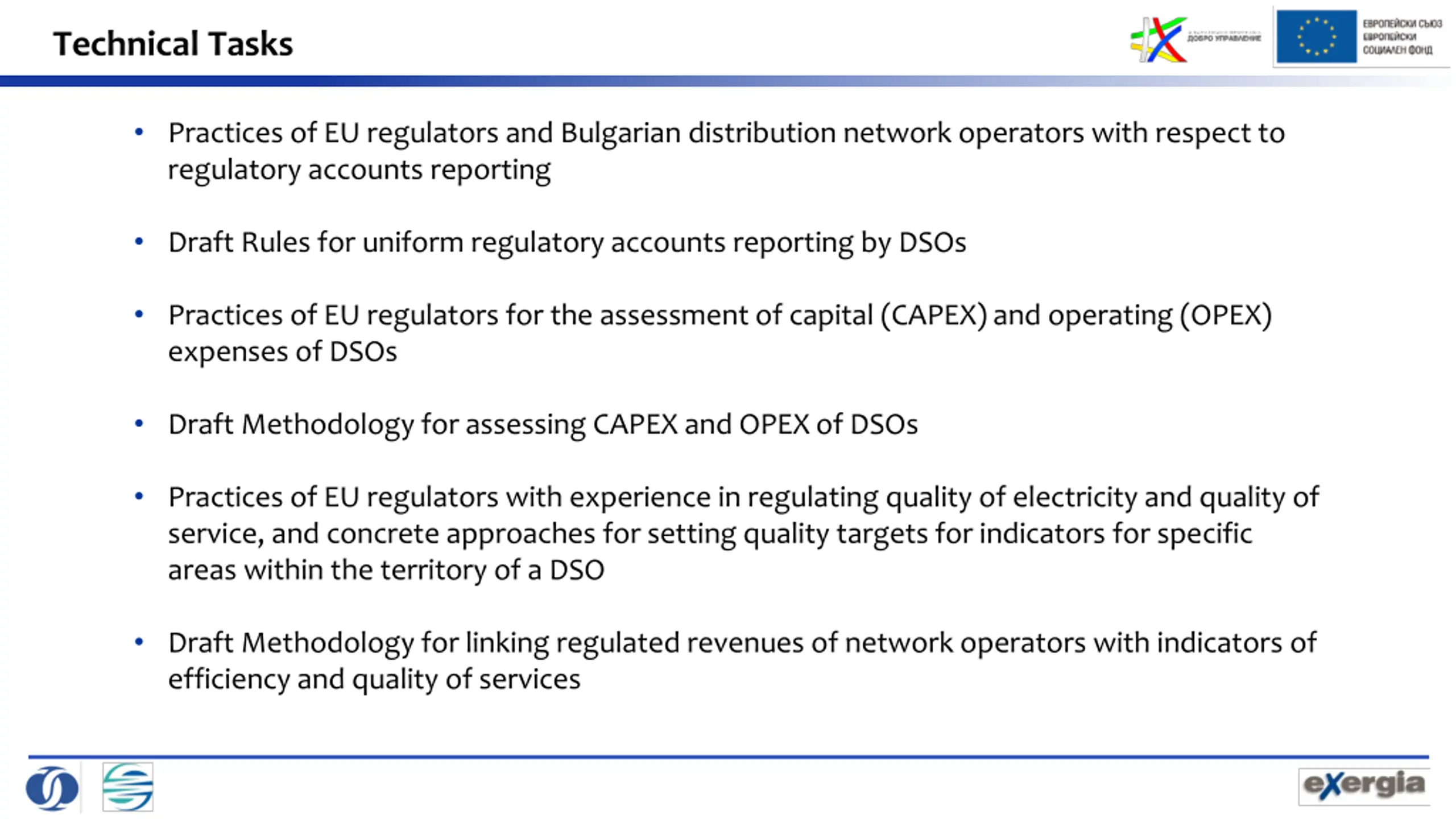 Technical Tasks Practices of EU regulators and Bulgarian distribution network operators with respect to regulatory accounts reporting Draft Rules for uniform regulatory accounts reporting by DSOs Practices of EU regulators for the assessment of capital (CAPEX) and operating (OPEX) expenses of DSOs Draft Methodology for assessing CAPEX and OPEX of DSOs Practices of EU regulators with experience in regulating quality of electricity and quality of service, and concrete approaches for setting quality targets for indicators for specific areas within the territory of a DSO Draft Methodology for linking regulated revenues of network operators with indicators of efficiency and quality of services