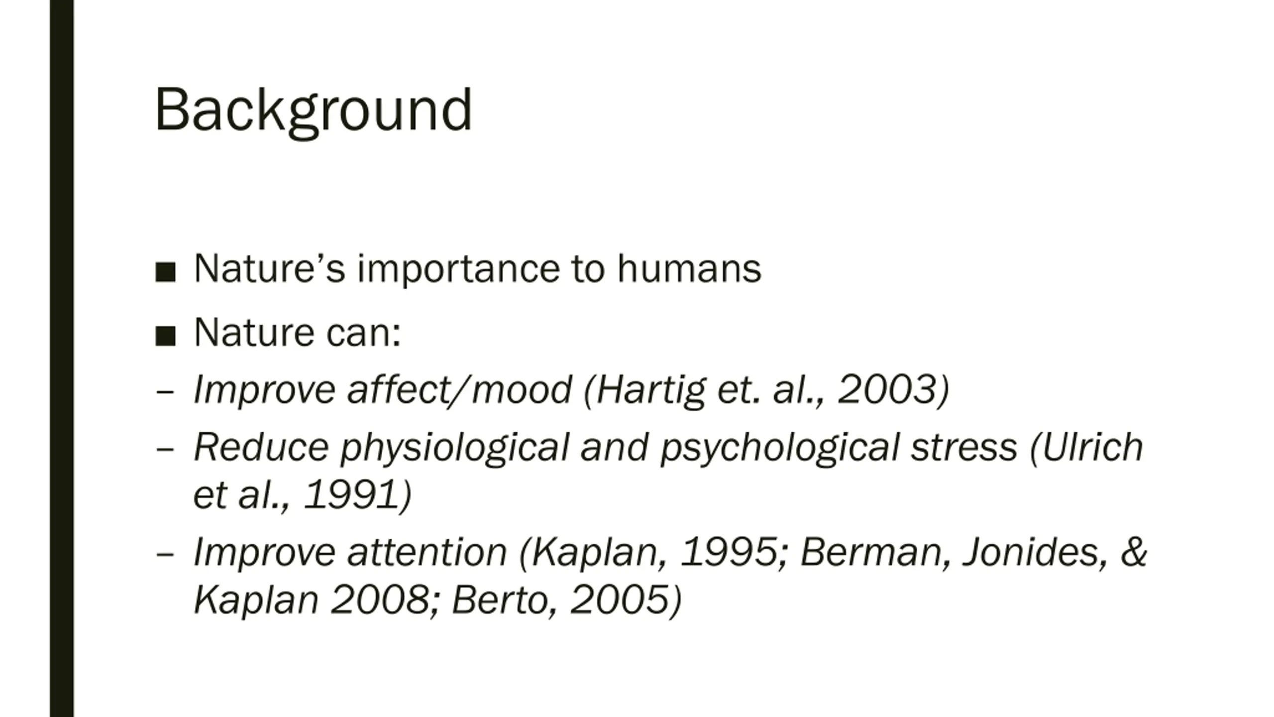 Background Nature s importance to humans Nature can: Improve affect/mood (Hartig et. al., 2003) Reduce physiological and psychological stress (Ulrich et al., 1991) Improve attention (Kaplan, 1995; Berman, Jonides, & Kaplan 2008; Berto, 2005)