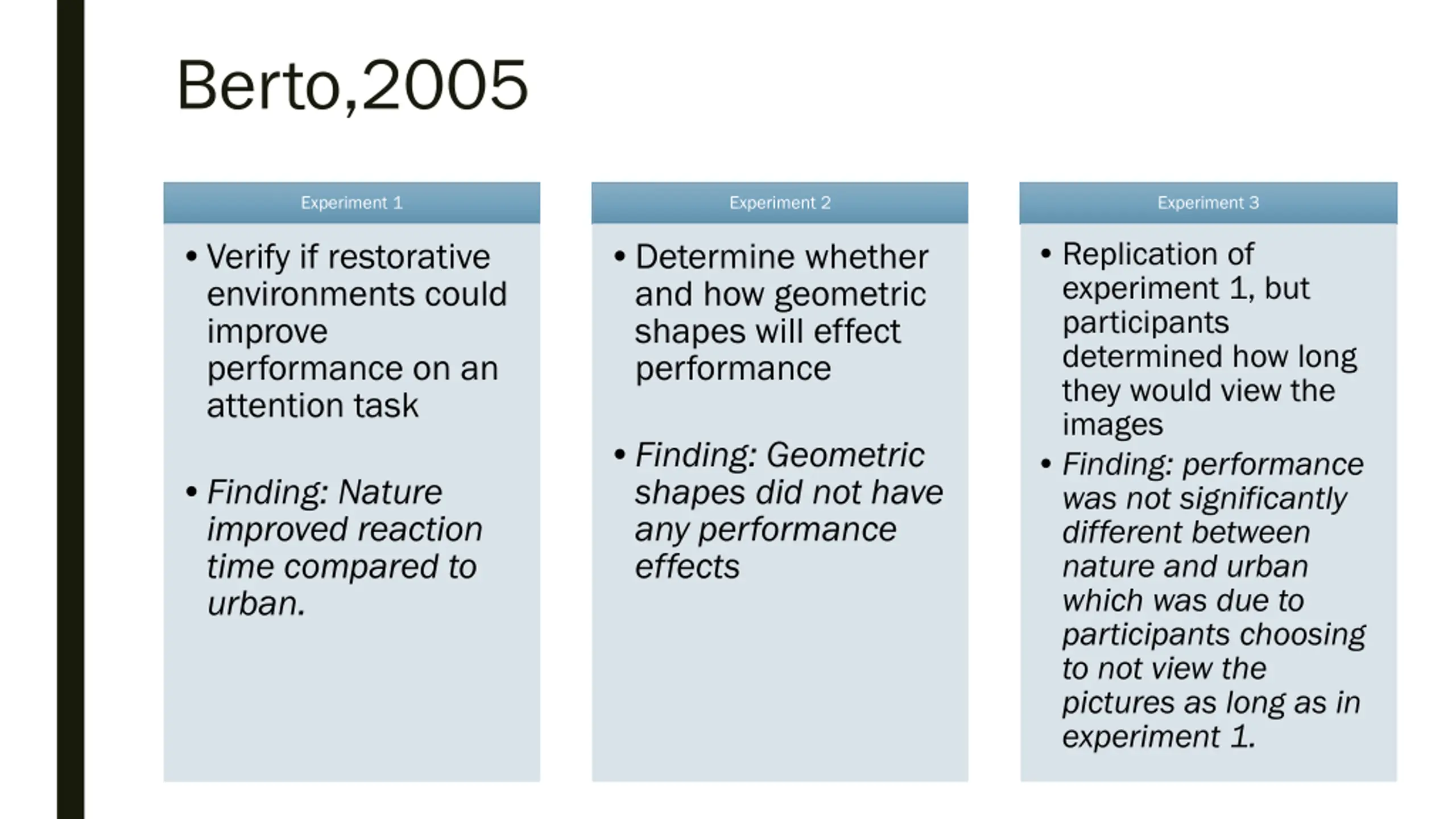 Berto,2005 Experiment 1 Experiment 2 Experiment 3 Replication of experiment 1, but participants determined how long they would view the images Finding: performance was not significantly different between nature and urban which was due to participants choosing to not view the pictures as long as in experiment 1. Verify if restorative environments could improve performance on an attention task Determine whether and how geometric shapes will effect performance Finding: Geometric shapes did not have any performance effects Finding: Nature improved reaction time compared to urban.