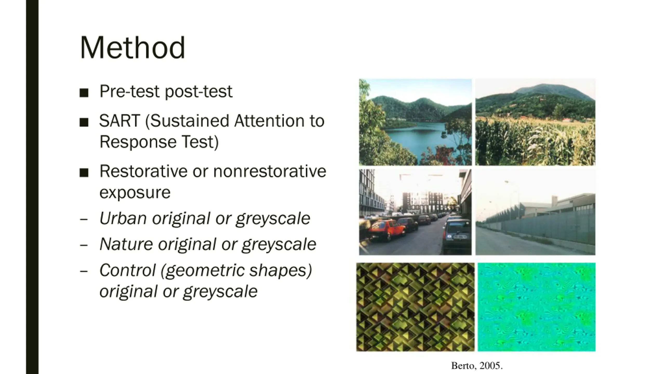 Method Pre-test post-test SART (Sustained Attention to Response Test) Restorative or nonrestorative exposure Urban original or greyscale Nature original or greyscale Control (geometric shapes) original or greyscale Berto, 2005.