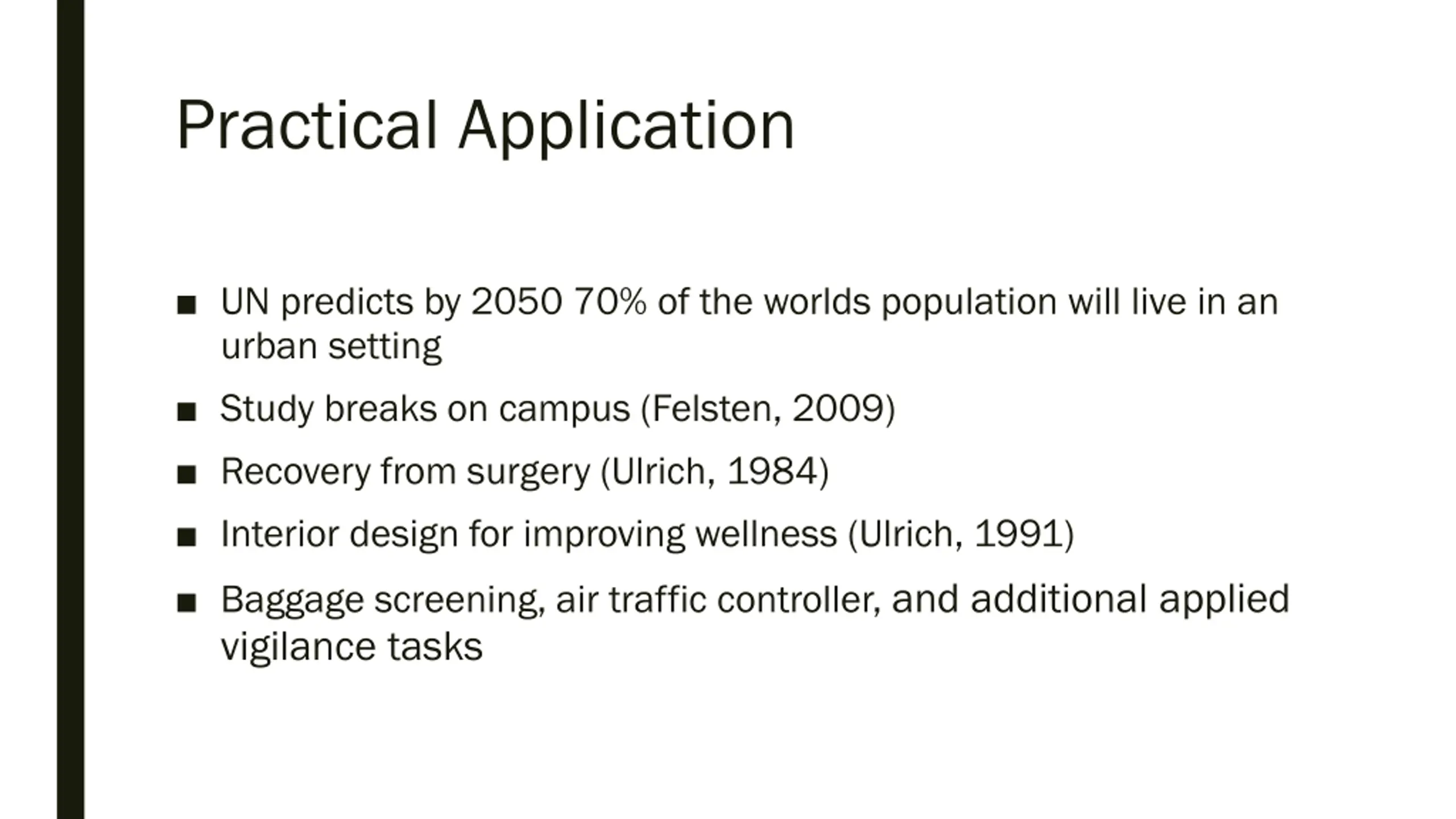 Practical Application UN predicts by 2050 70% of the worlds population will live in an urban setting Study breaks on campus (Felsten, 2009) Recovery from surgery (Ulrich, 1984) Interior design for improving wellness (Ulrich, 1991) Baggage screening, air traffic controller, and additional applied vigilance tasks