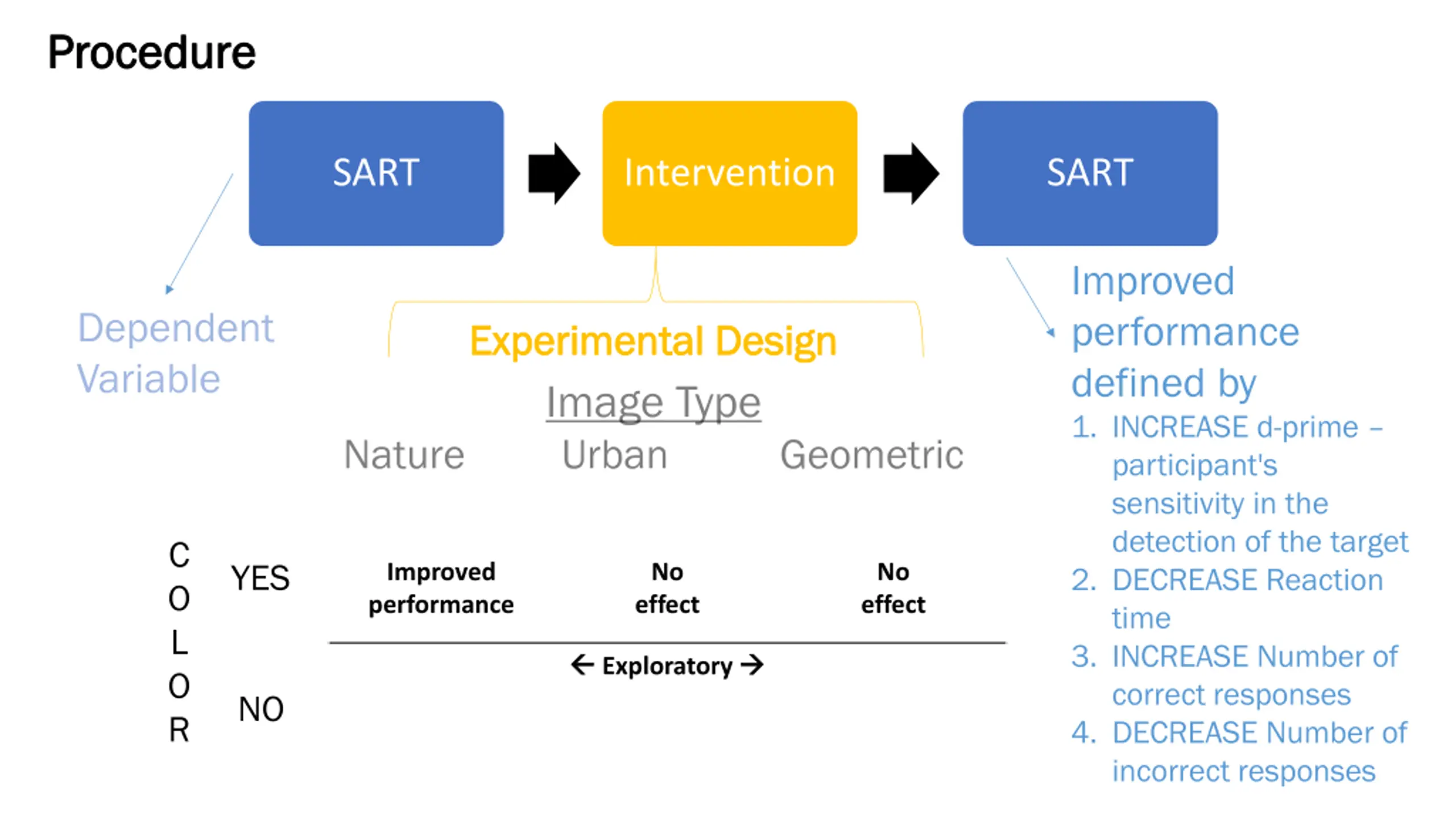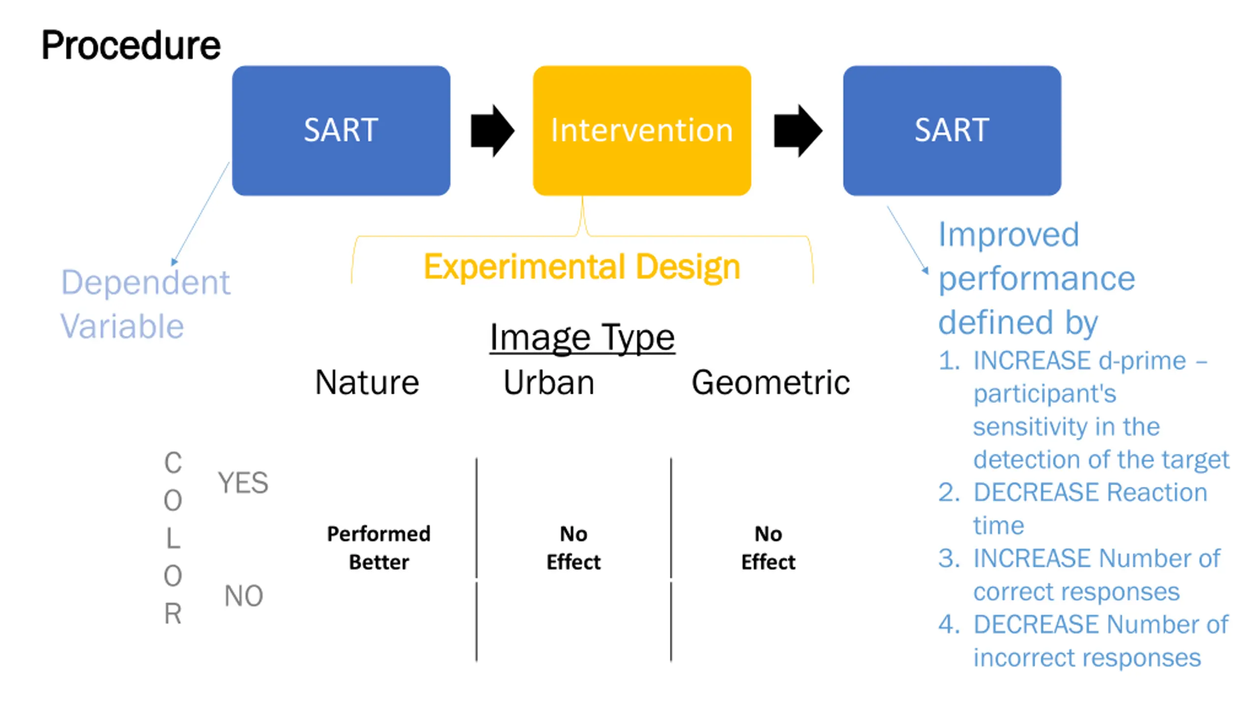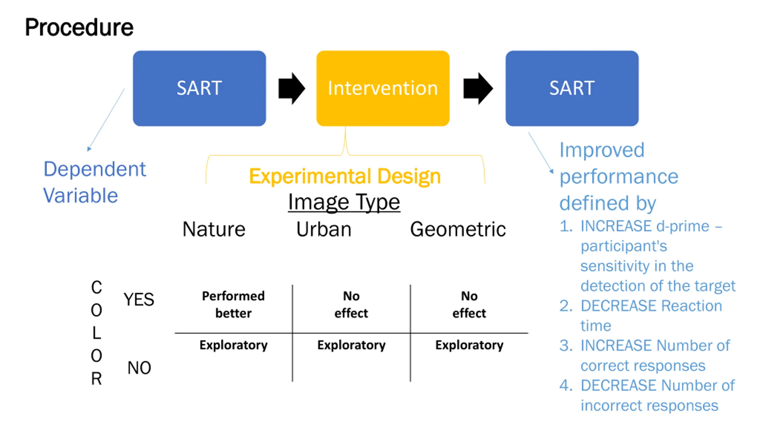 Procedure Procedure SART Intervention SART Improved performance defined by 1. INCREASE d-prime participant's sensitivity in the detection of the target 2. DECREASE Reaction time 3. INCREASE Number of correct responses 4. DECREASE Number of incorrect responses Dependent Variable Experimental Design Experimental Design Image Type Urban Nature Geometric C O L O R YES Performed better No effect No effect Exploratory Exploratory Exploratory NO